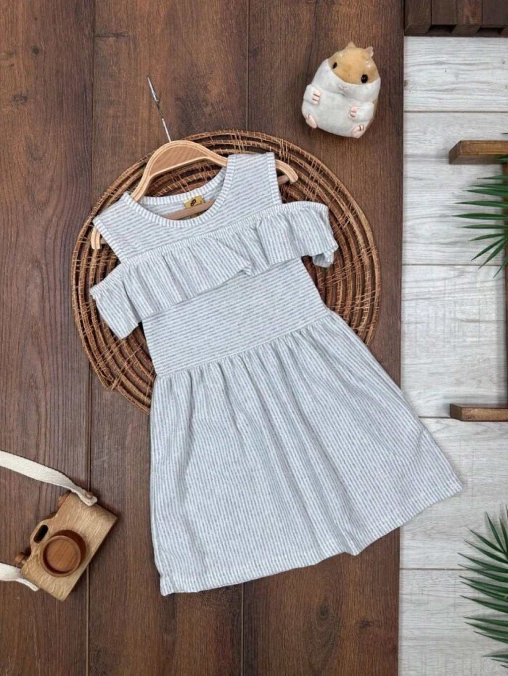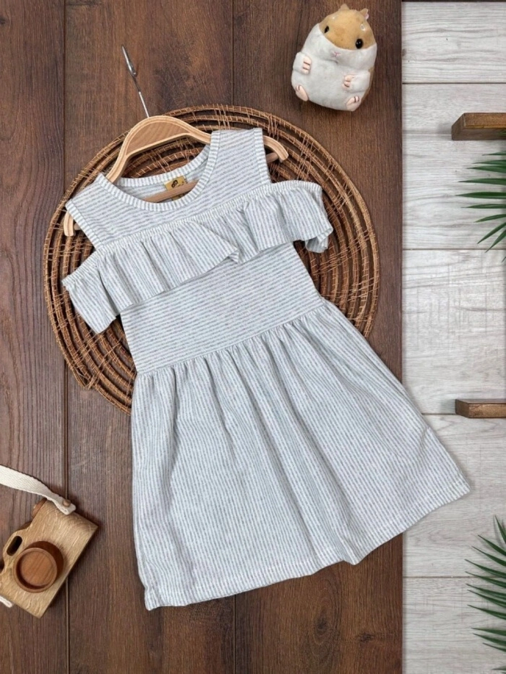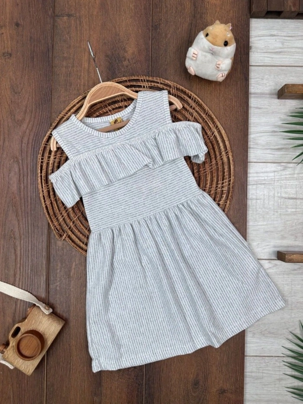 ASKILI ELBİSE KIZ ÇOCUK GRİ PAMUKLU,YAZLIK KIZ ÇOCUK ÇİZGİLİ DESENLİ ELBİSE