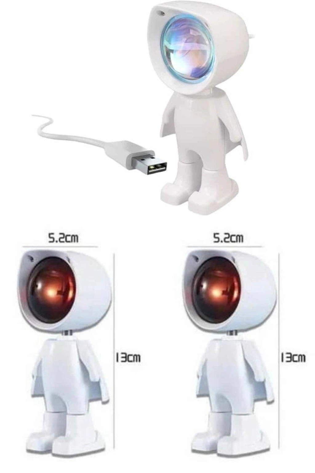 Gün batımı efektli bu şarjlı lamba, sevimli astronot tasarımı ile dikkat çeken hem işlevsel hem de dekoratif bir aydınlatma çözümüdür. LED ışık kaynağı sayesinde loş, yumuşak ve sıcak bir aydınlatma sunar; böylece ortamda huzurlu ve sakin bir atmosfer yaratır. Özellikle yatak odası, oturma odası ya da çalışma alanları gibi kişisel yaşam alanlarında hem gece lambası hem de ortam ışığı olarak rahatlıkla kullanılabilir.360 derece dönebilen başlığı ve 60 derece yukarı-aşağı hareket kabiliyeti sayesinde ışığın açısını kolaylıkla ayarlayabilir, istediğiniz duvar ya da alana doğrudan yansıtabilirsiniz. Bu sayede yalnızca ortama ışık vermekle kalmaz, aynı zamanda dekoratif bir efekt yaratır. Kompakt ve taşınabilir yapısıyla ev dışında da rahatlıkla kullanılabilir; ister seyahatlerde ister dış mekân etkinliklerinde şarjlı yapısıyla kablosuz olarak yanınızda taşıyabilirsiniz.USB kablosu ile kolayca şarj edilen bu ürün, tam dolumda yaklaşık 3-4 saat kesintisiz kullanım sunar. Güç kaynağına bağlıyken ise sınırsız kullanım avantajı sağlar. Dokunmatik kontrol paneli ile ışığı açıp kapamak ve parlaklık seviyesini ayarlamak son derece pratiktir. Bu özellik, hem kullanım kolaylığı hem de modern bir deneyim sunar.Gün batımı projektör lambası, yalnızca fonksiyonel bir gece lambası değil, aynı zamanda romantik ve sıcak bir ambiyans yaratmak isteyenler için eşsiz bir aksesuardır. Film izlerken, kitap okurken ya da sadece dinlenmek istediğinizde ortamı yumuşak ışığıyla dönüştürür. Ayrıca fotoğraf ve video çekimlerinde es bir arka plan ışığı olarak da kullanılabilir. Şıklığı ve işlevselliği bir arada sunan bu ürün, hem kendiniz için hem de sevdiklerinize hediye olarak ideal bir tercihtir.