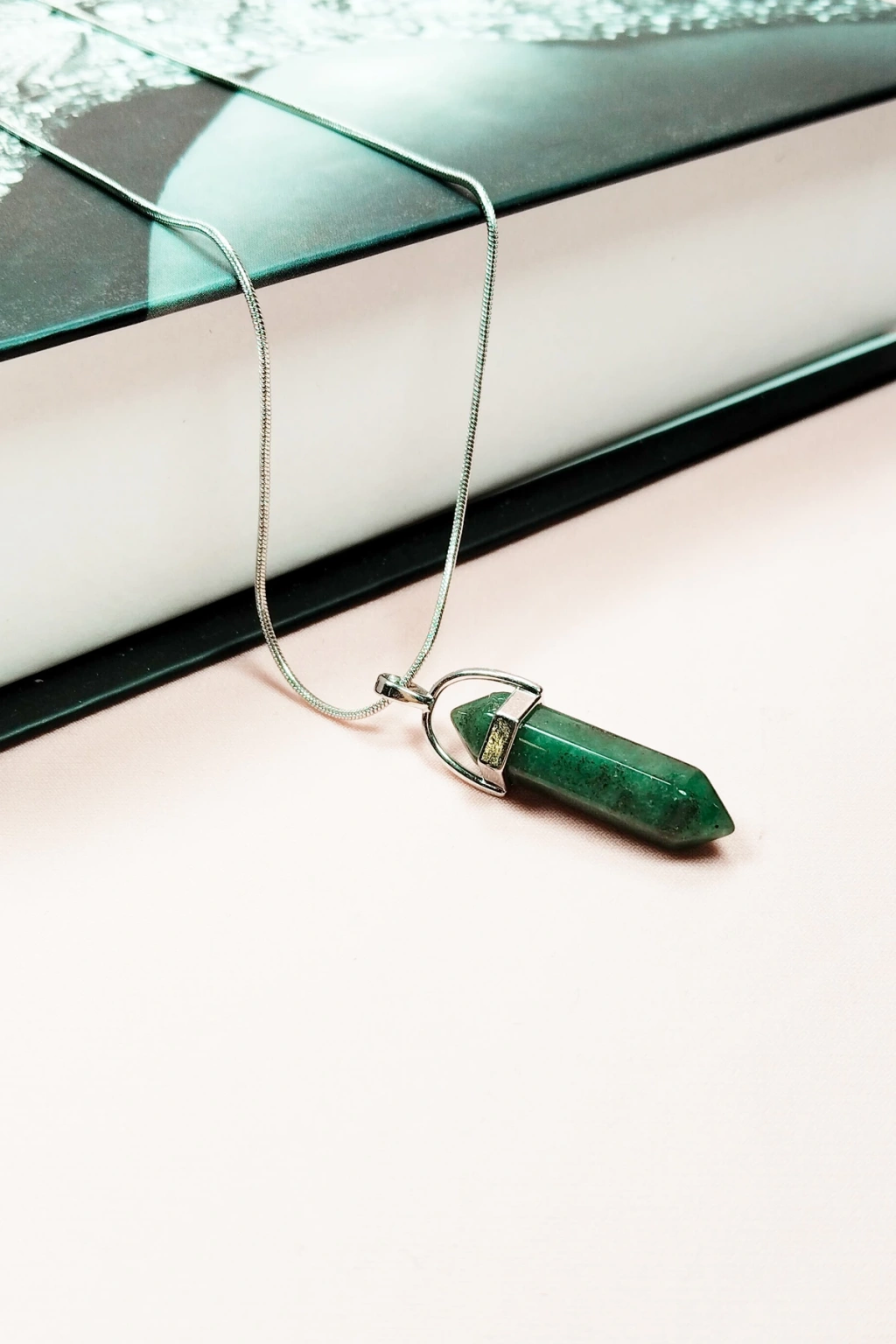 Yeşil Kuvars Doğal Taşı Zincirli El Yapımı Tasarımlı Kolye Uç: 3,5 cm Zincir: 20 cm Kutulu