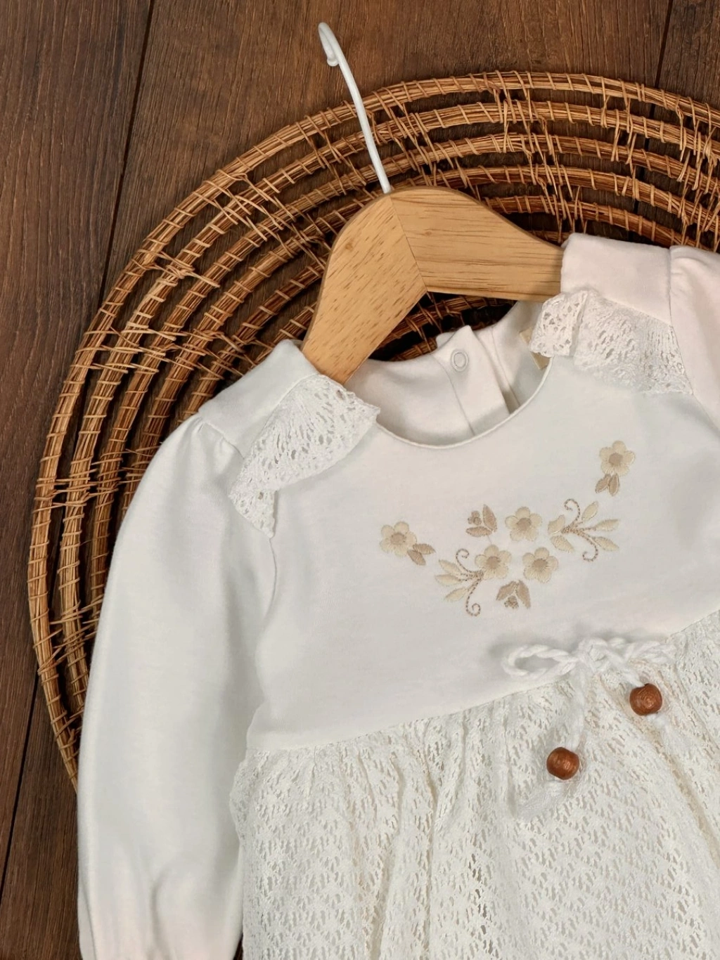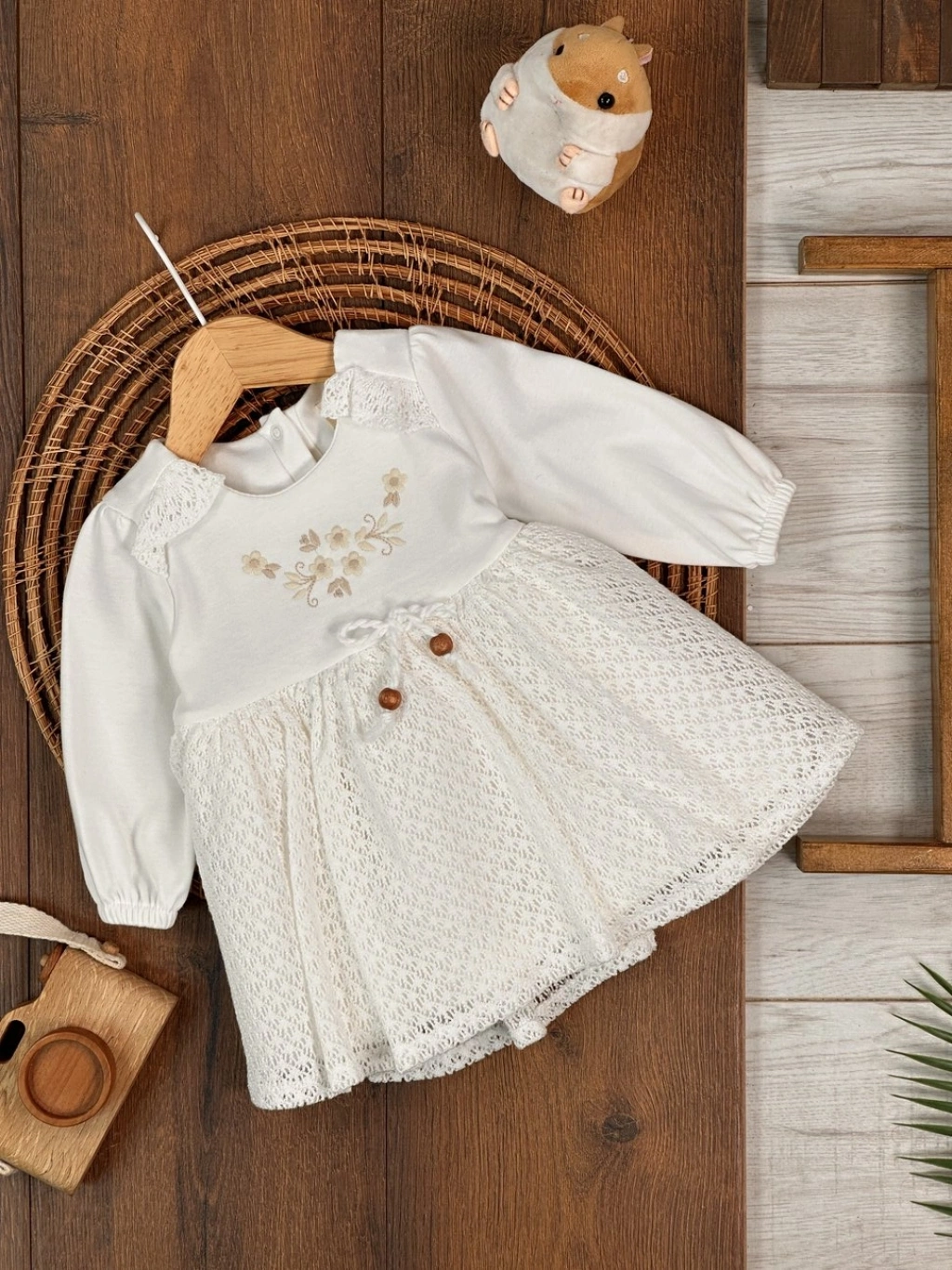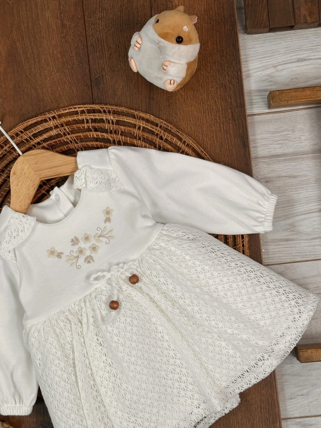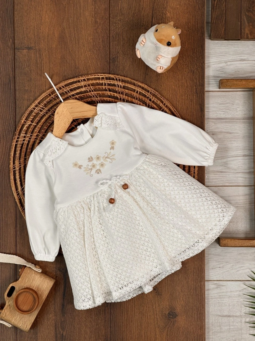 Bahar Pamuklu Çiçek Nakışlı Kız Bebek Elbise