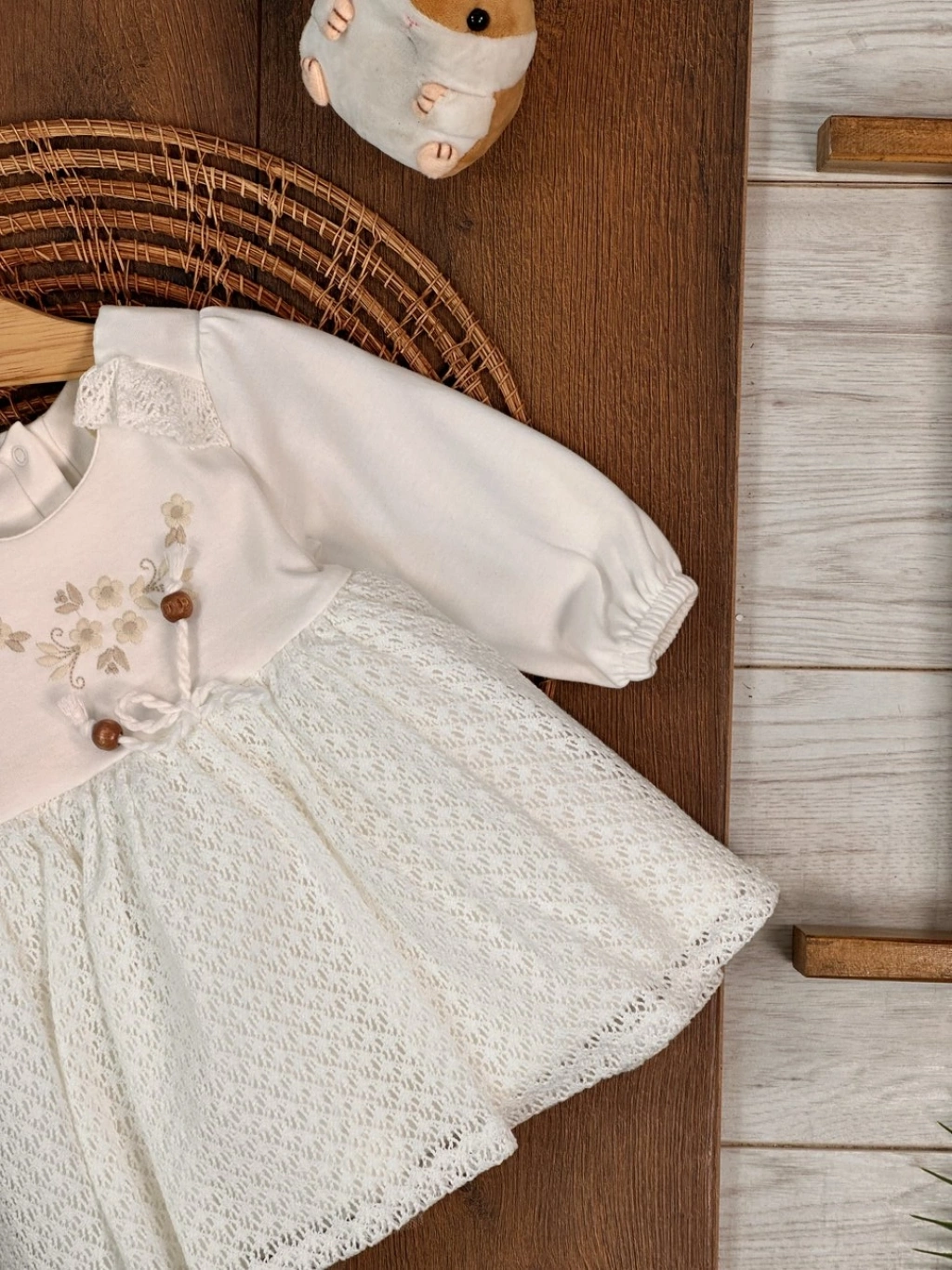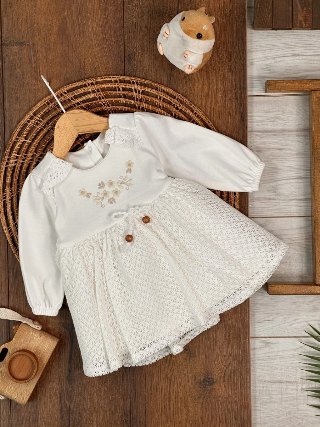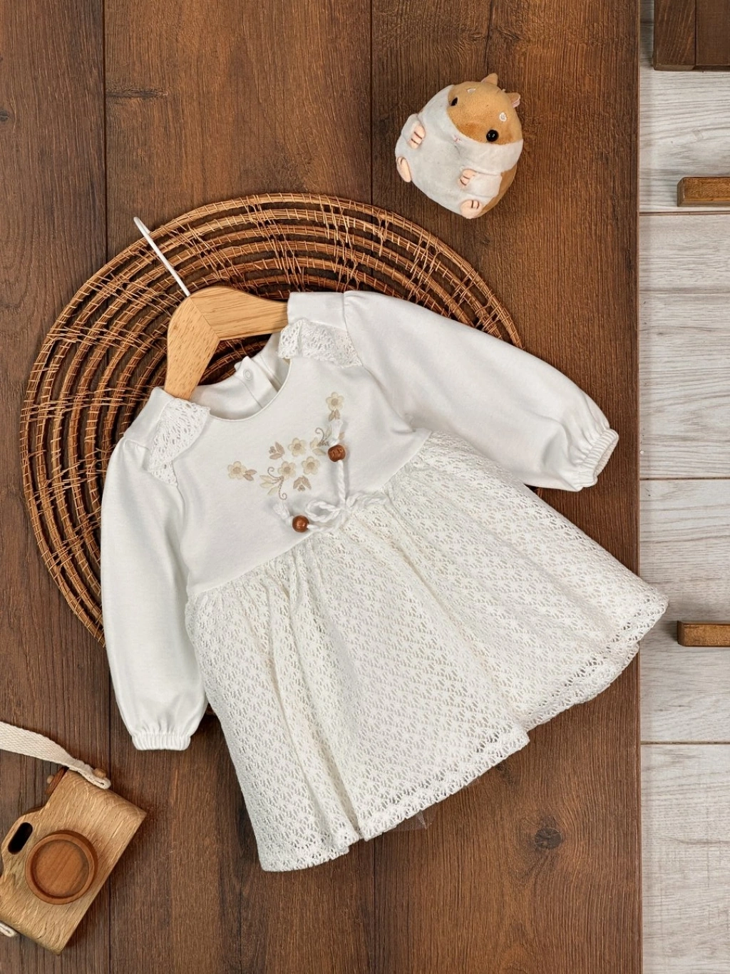 Bahar Pamuklu Çiçek Nakışlı Kız Bebek Elbise