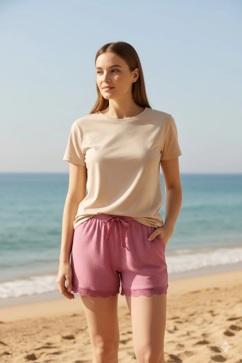 Bambu Fitilli Kadın Ev Şortu Bacak Dantel Detaylı Ev Giyim Fuşya<br />Ev giyim pijama dantel detaylı kadın şort <br />bambu şort <br />kadın ev giyim<br />