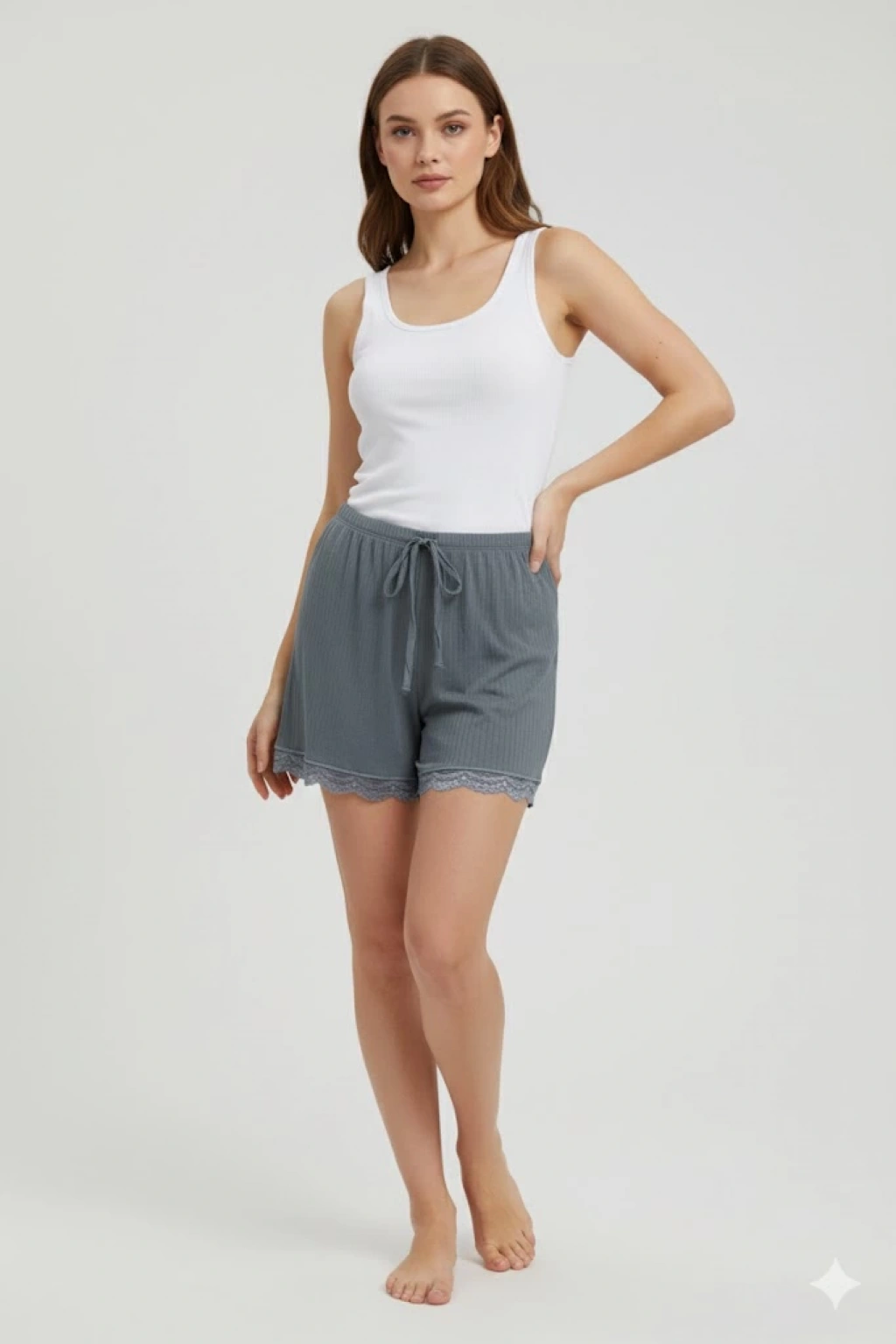 Bambu Fitilli Kadın Ev Şortu Bacak Dantel Detaylı Ev Giyim Gri<br />Ev giyim pijama dantel detaylı kadın şort <br />bambu şort <br />kadın ev giyim<br />