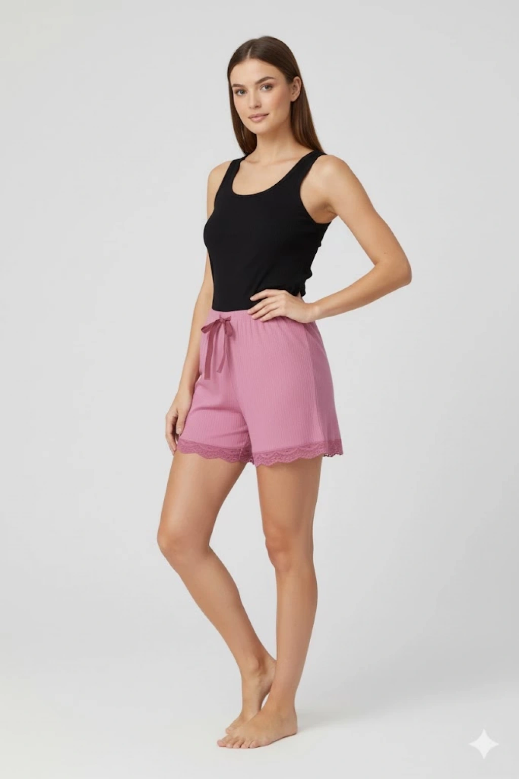 Bambu Fitilli Kadın Ev Şortu Bacak Dantel Detaylı Ev Giyim Pembe <br />Ev giyim pijama dantel detaylı kadın şort <br />bambu şort <br />kadın ev giyim<br />