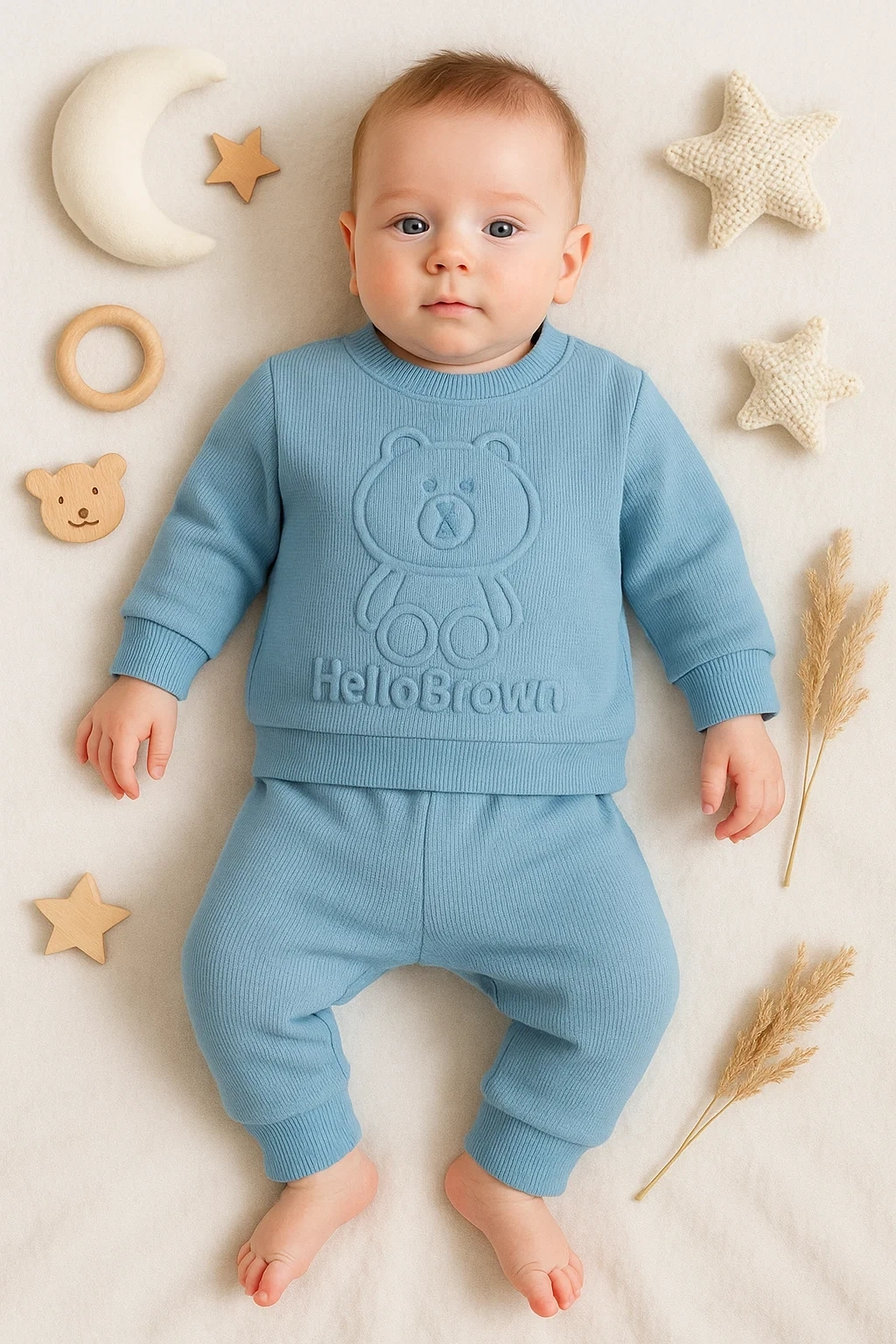 Bear Gofre Kabartmalı 2'li Erkek Bebek Takımı