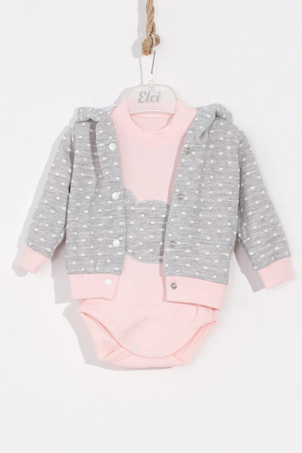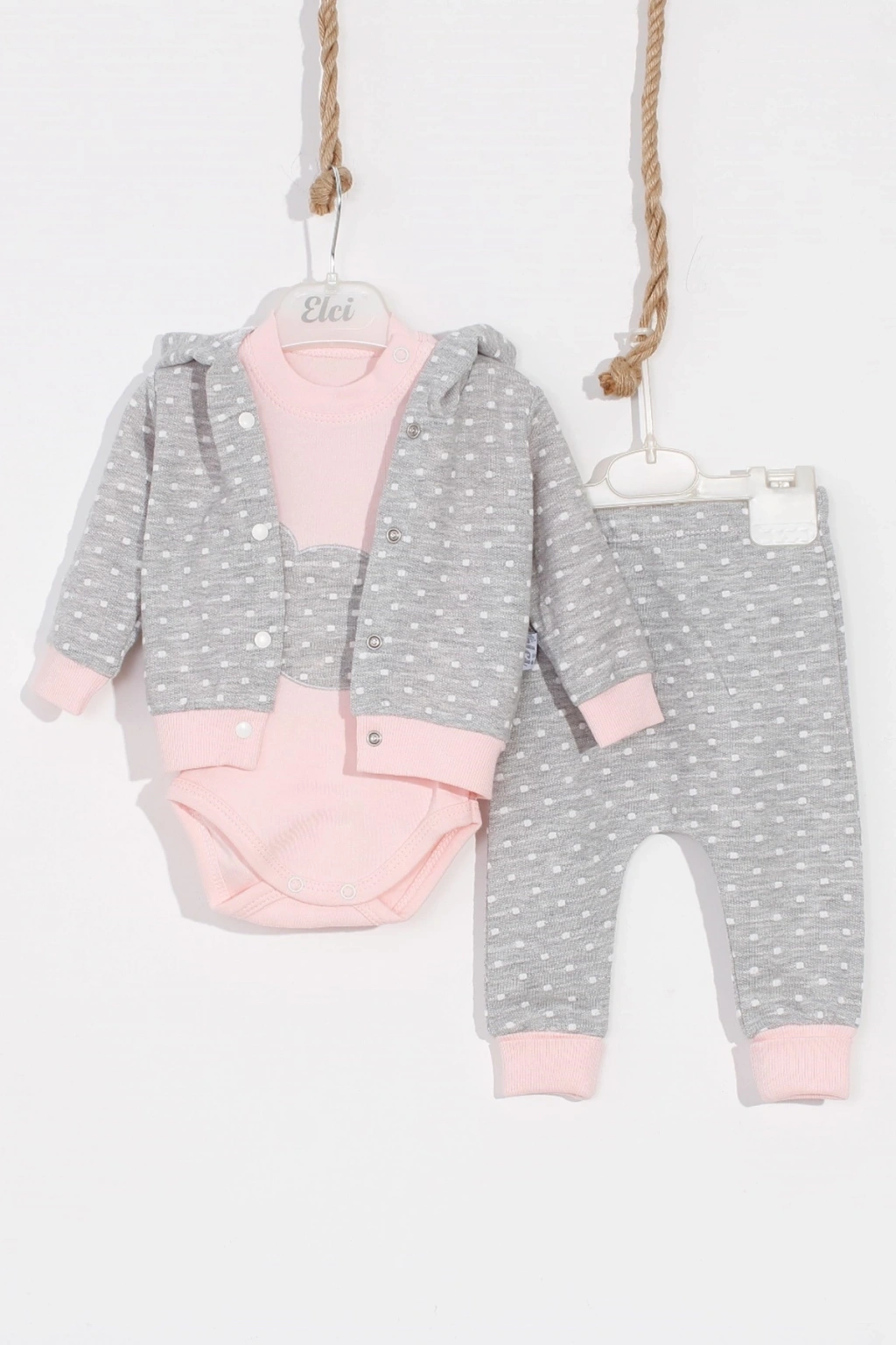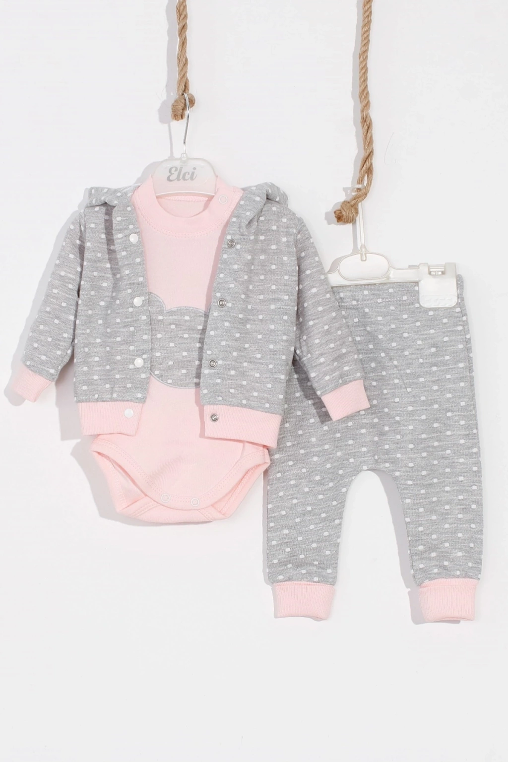 Puan Desenli Kapişonlu % 100 Pamuk 3'lü Kız Bebek Takım