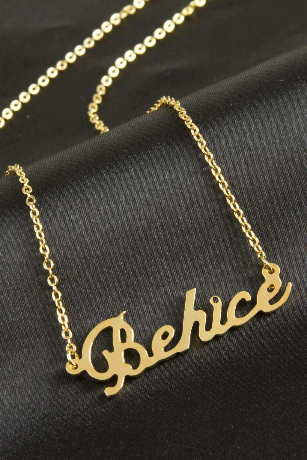 Behice isimli kolye. İsimli kolye pirinç madeninden ve altın kaplamalıdır. Kişiye özel üretilmektedir.Yazdırmak istediğiniz ismi bize mesaj olarak iletmeniz gerekmektedir. Kullanıma bağlı olarak uzun süre kullanıma uygundur. Ürün malzemesi 1.sınıf kalitededir. Ürün ve zinciri sarı renktedir. Ürün zincir boyu 45 cm ve ürün üzerindeki isimler yaklaşık 3 cmdir. İsim boyları ürün ismine göre degişiklik göstermektedir.