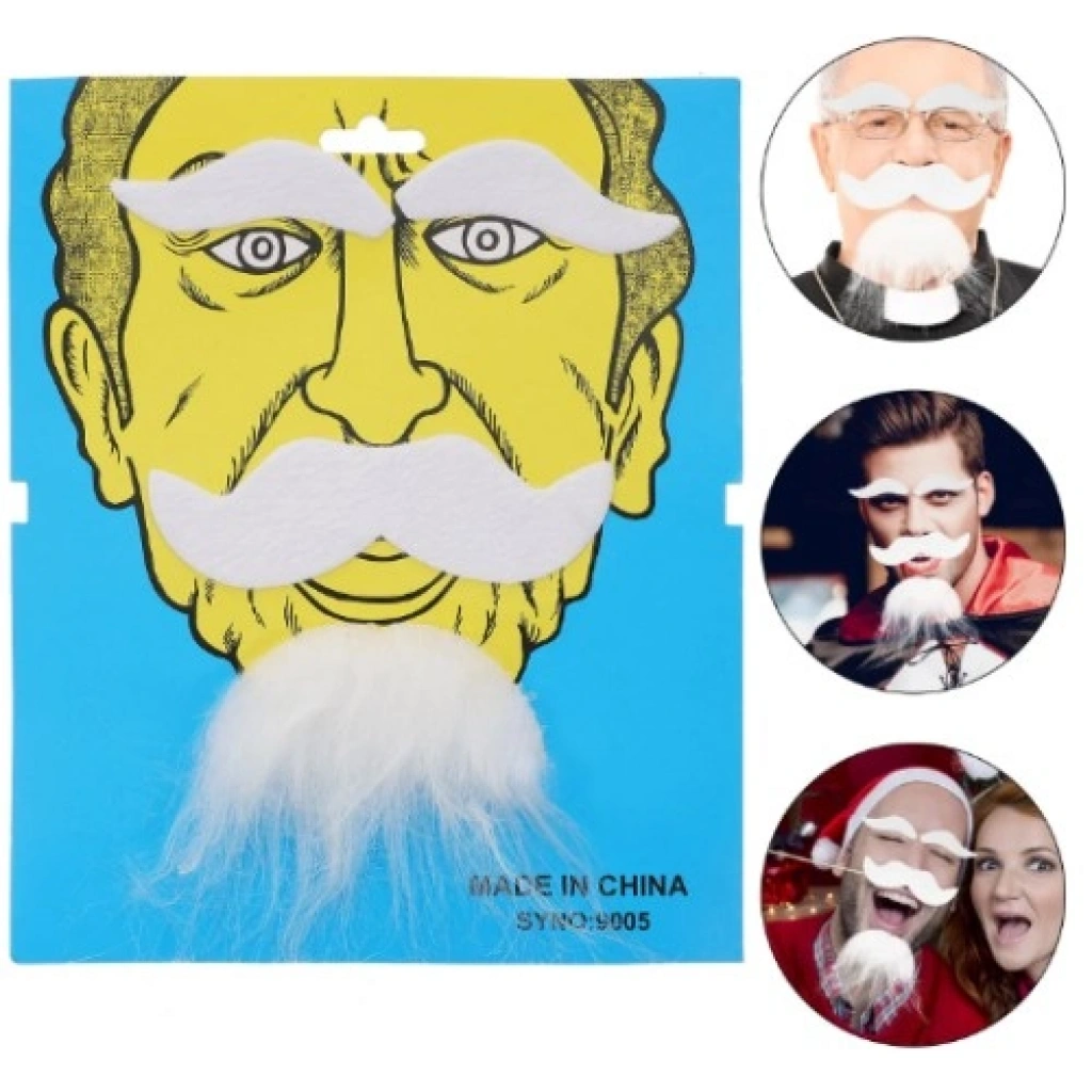 Beyaz Renk Kendinden Yapışkanlı Takma Sakal Bıyık ve Kaş SetiKostüm ve sahne kombinlerini pratik şekilde tamamlamak için tasarlanan beyaz renk kendinden yapışkanlı takma sakal bıyık ve kaş seti, kolay kullanımıyla öne çıkar. Yapıştırıcı gerektirmeyen kendinden yapışkanlı yapısı sayesinde hızlıca takılıp çıkarılabilir ve konforlu bir kullanım sunar.Paket içerisinde 1 adet sakal, 1 adet bıyık ve 2 adet kaş yer alır. Yetişkinler ve çocuklar için uygun olan bu takma sakal seti, hafif yapısı sayesinde kullanım sırasında rahatsızlık vermez. Karakter kostümleri ve temalı kombinler için ideal bir tamamlayıcıdır.Kostüm partileri, tiyatro ve sahne gösterileri, okul etkinlikleri, Halloween organizasyonları ve fotoğraf çekimleri için uygun olan bu beyaz takma sakal bıyık kaş seti, kısa sürede etkili bir karakter görünümü oluşturmak isteyenler için kullanışlı bir kostüm aksesuarıdır.
