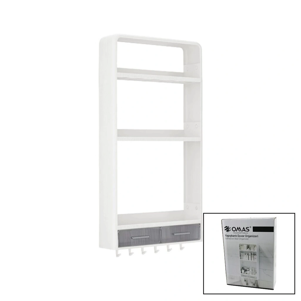BEYAZ YAPIŞKANLI DUVAR ORGANİZERİ PLASTİK 3 RAF=14CM-19CM-30CM - 2 ÇEKMECE=40CM - 6 ASKI 19 PARÇA (4887)