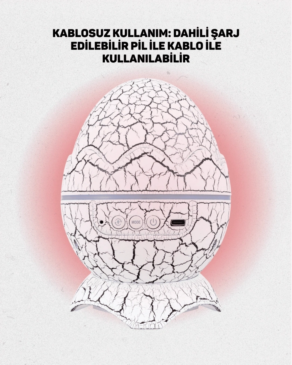 Bu çok amaçlı gece lambası, dikkat çekici dinozor yumurtası tasarımı ile es bir görünüm sunarken, işlevsel yapısıyla yaşam alanlarına değer katar. Ürün, 13.5 × 13.5 × 18 cm boyutlarındadır ve yalnızca 402 gram ağırlığındadır. ABS ve PVC malzemeden üretilmiş olup hem hafif hem dayanıklıdır. 5V 1A USB kablosu (1 metre) ile şarj edilebilir. Yüksek kaliteli COB LED’lerle donatılan projektör; beyaz, mavi, kırmızı gibi 7 farklı renk seçeneği sunar. Çocuk odası, oturma odası veya yatak odasında kullanıma uygundur.