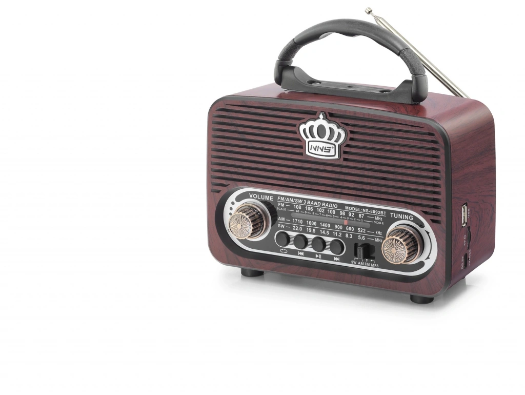 Nns NS8092BT, Klasik Radyo Zarafetini Modern Dijital Özelliklerle Harmanlayan, 18 Cm Genişliğinde Kompakt Ve Estetik Bir Nostaljik Ses Sistemidir. Koyu Ahşap Dokulu Şık Kasası, Ön Panelindeki İkonik Kral Tacı Logosu Ve Üst Kısımdaki Ergonomik Taşıma Kulbuyla Bulunduğu Her Ortama Vintage Bir Karakter Katarken, Güncel Bluetooth 5.0 Altyapısıyla Kesintisiz Bir Müzik Akışı Sağlar.