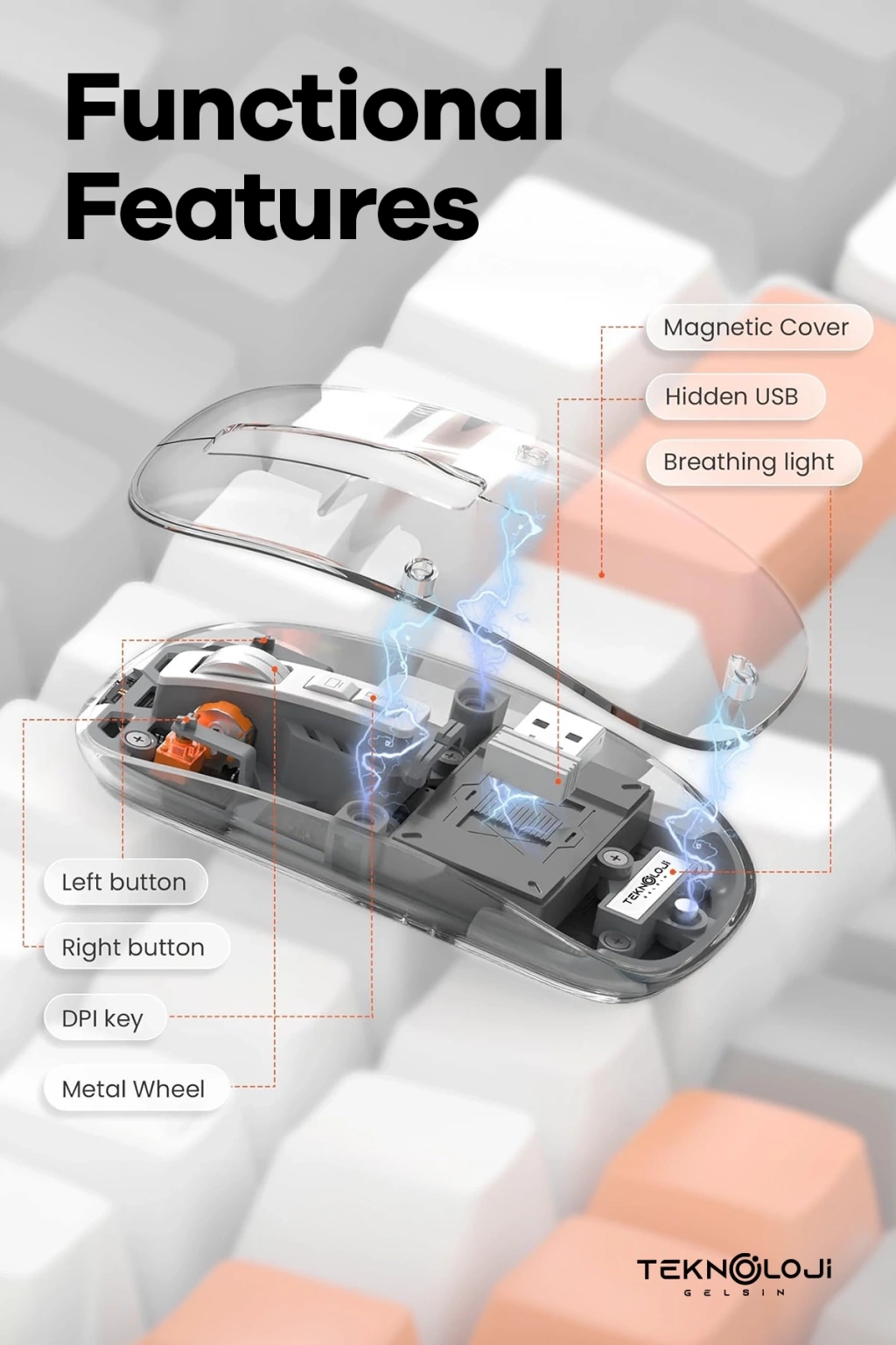 Yeni nesil Bluetooth + USB çift modlu kablosuz mouse, teknolojiyi zarafetle birleştirir. Ofis, okul veya ev ortamında kesintisiz çalışma için tasarlanan bu mouse, hem sessiz hem ergonomiktir. Şeffaf mıknatıslı kapağı, modern tasarımıyla estetik bir görünüm sunarken, Type-C hızlı şarj desteğiyle uzun ömürlü bir kullanım sağlar.