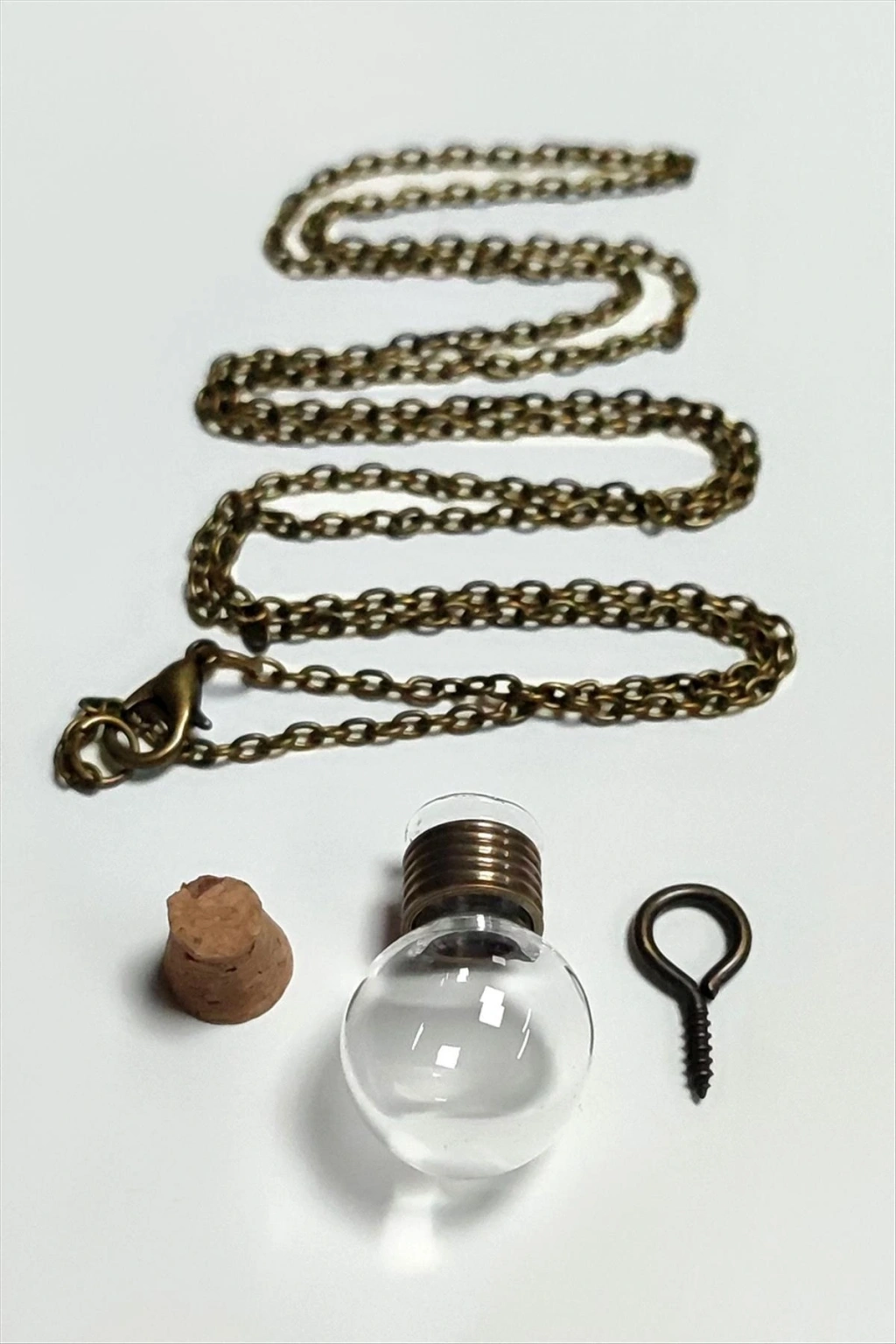 Kolye; Ürün malzemesi cam ve metaldir. Ürün cam boyu 17*25 mm ve zincir boyu 60 cmdir. Ürün demonte şeklinde gönderilecektir. İstediğiniz aparatı içine koyarak kullanabilirsiniz.