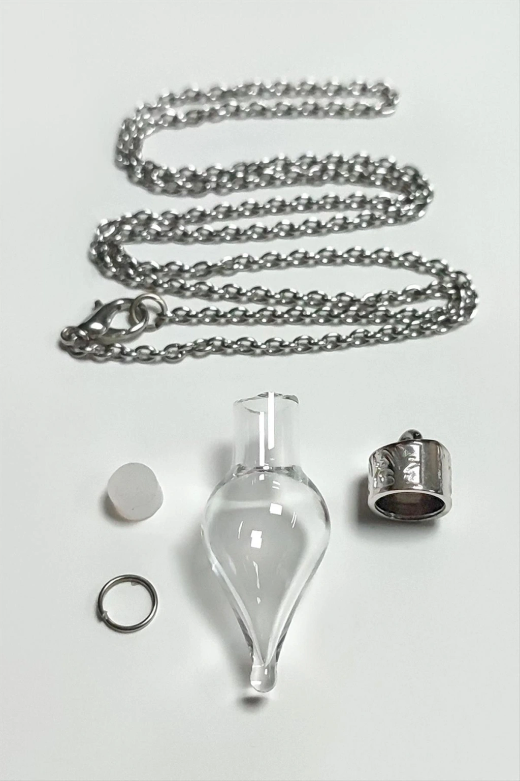 Kolye; Ürün malzemesi cam ve metaldir. Ürün cam boyu 15*35 mm ve zincir boyu 60 cmdir. Ürün demonte şeklinde gönderilecektir. İstediğiniz aparatı içine koyarak kullanabilirsiniz.