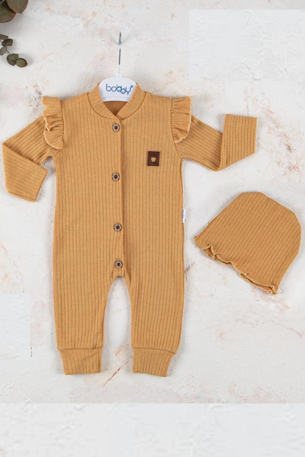 Boydan Düğmeli Şapkalı % 100 Pamuk Kız Bebek Tulumu.