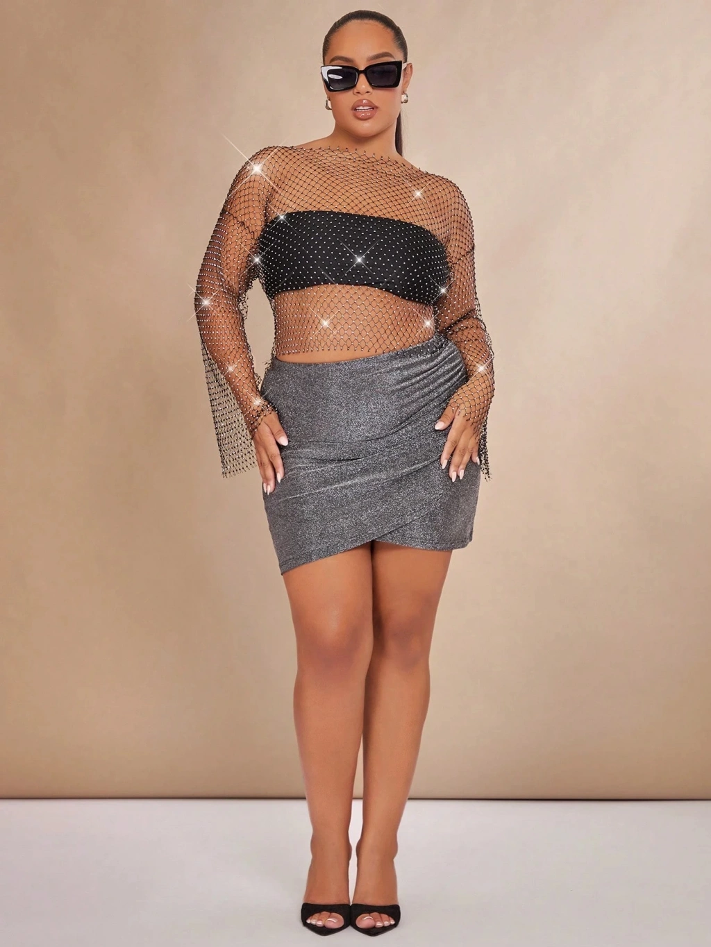 Kadın Metalik gümüş Pul Detaylı Crop Askılı Önden Bağlama 5093