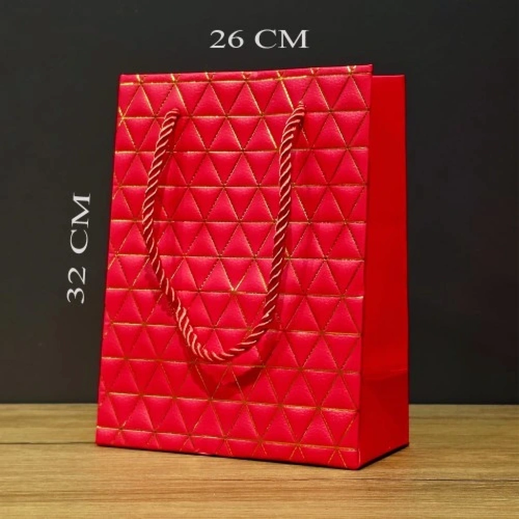 Büyük Boy Kırmızı Gold Desenli Hediye Çantası Büyük boy kırmızı ve gold renkli hediye çantası, şık tasarımı ve özel desenleri ile özel günlerin vazgeçilmez aksesuarlarından biridir. Doğum günü, sevgililer günü veya babalar günü gibi anlamlı günlerde hediyenizi bu zarif çanta ile verebilirsiniz. Kırmızı zemin üzerindeki gold desenler, çantaya göz alıcı bir görünüm kazandırır.Büyük boy yapısı sayesinde hediyelerinizi rahatça yerleştirebilir ve şık bir sunum oluşturabilirsiniz. İpli tutma kısmı ile kolay taşınabilen bu karton çanta, günlük kullanımda da dekoratif bir aksesuar olarak tercih edilebilir.ÖzelliklerKaliteli karton malzemeden üretilmiştir.Şık tasarımı ve gold desenleri ile dikkat çekicidir.Dekoratif olarak kullanılabilir.İpli tutma sapı sayesinde pratik taşınabilirlik sağlar.Ölçü26 cm x 32 cm