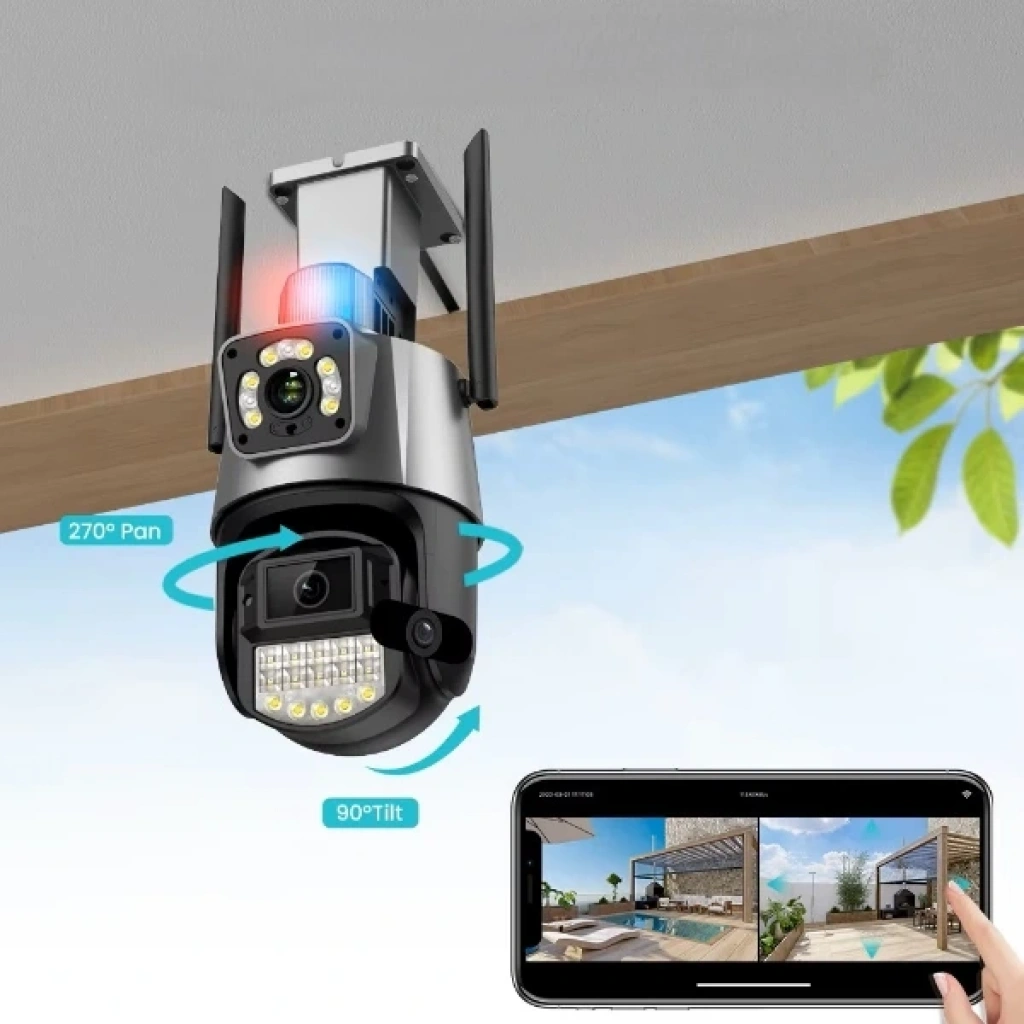 ÇAKARLI ÇİFT LENSLİ DIŞ MEKAN GÜVENLİK KAMERASIÜrün ÖzellikleriÇakarlı çift lensli dış mekan güvenlik kamerası, yüksek çözünürlüklü 8MP görüntü kalitesiyle profesyonel güvenlik çözümleri sunar. Çift lens tasarımı sayesinde geniş açılı ve detaylı görüntü sağlar. Gece görüş özelliği ile düşük ışıkta bile net kayıt yapabilir ve tam renkli gece görüntüleme desteğiyle güvenliği en üst seviyeye taşır. Çakarlı alarm özelliği sayesinde şüpheli durumlarda görsel ve işitsel uyarı verir. Çift yönlü ses desteği sayesinde kamera üzerinden karşılıklı iletişim kurulabilir. IP66 su geçirmezlik standardına sahip olan kamera, yağmur, kar ve toz gibi zorlu hava koşullarında sorunsuz çalışır. Hareket algılama özelliği ile anında mobil cihazlara bildirim gönderir ve Bluetooth desteğiyle hızlı bağlantı imkânı sunar. PTZ kontrol desteği sayesinde 355° yatay ve 90° dikey açıyla çevreyi eksiksiz izleyebilirsiniz.Paket İçeriği1 adet Çakarlı Çift Lensli Dış Mekan Güvenlik Kamerası
