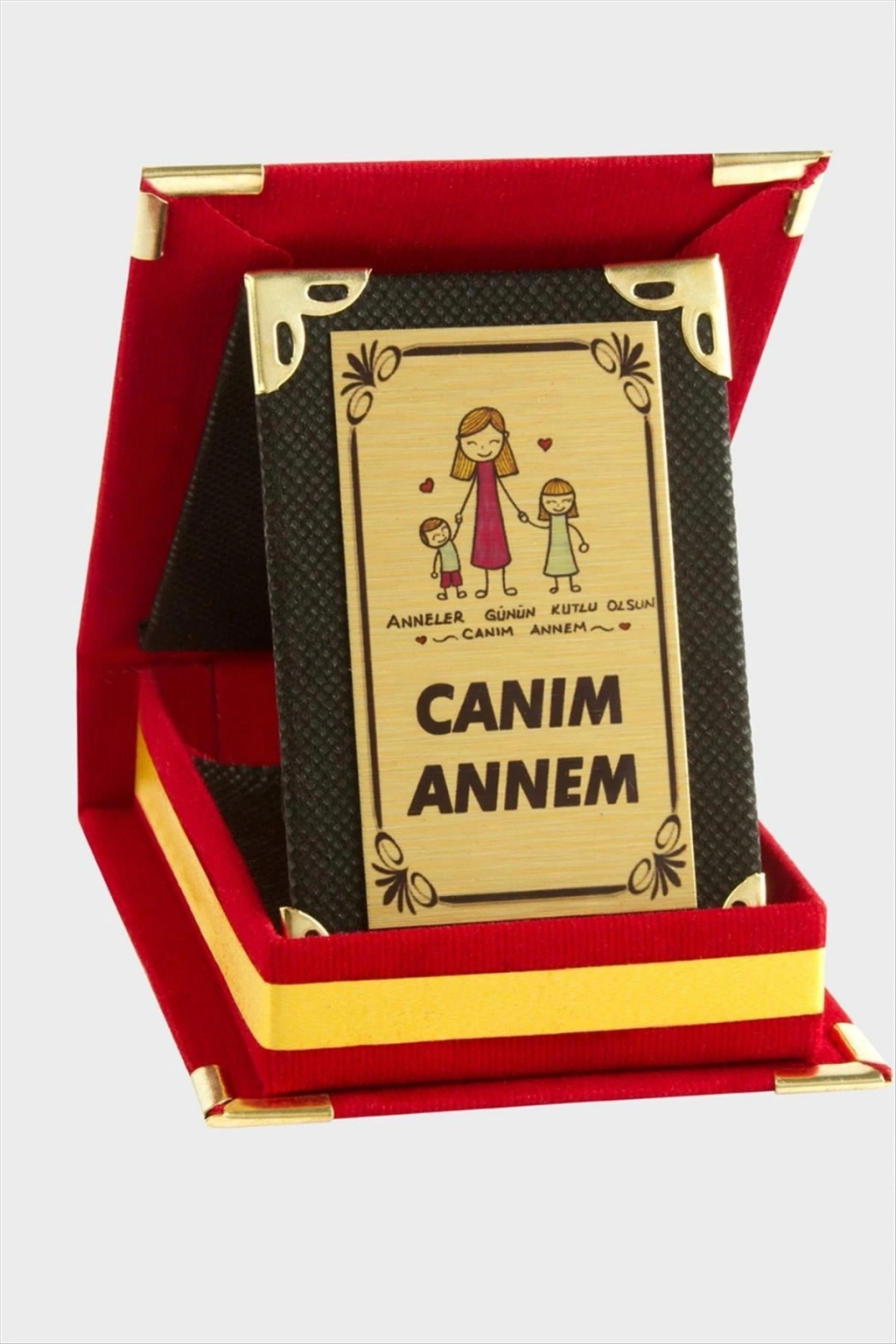 Süet kutulu plaket, metal üzerine yazı yazılarak üretilmiştir, ölçüleri kurulu vaziyette; yükseklik: 11cm, genişlik: 8cm'dir.