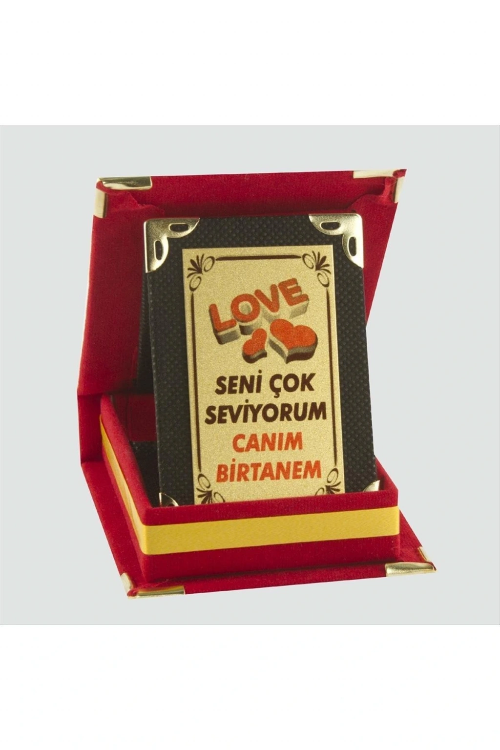 Süet kutulu plaket, metal üzerine yazı yazılarak üretilmiştir, ölçüleri kurulu vaziyette; yükseklik: 11cm, genişlik: 8cm'dir.