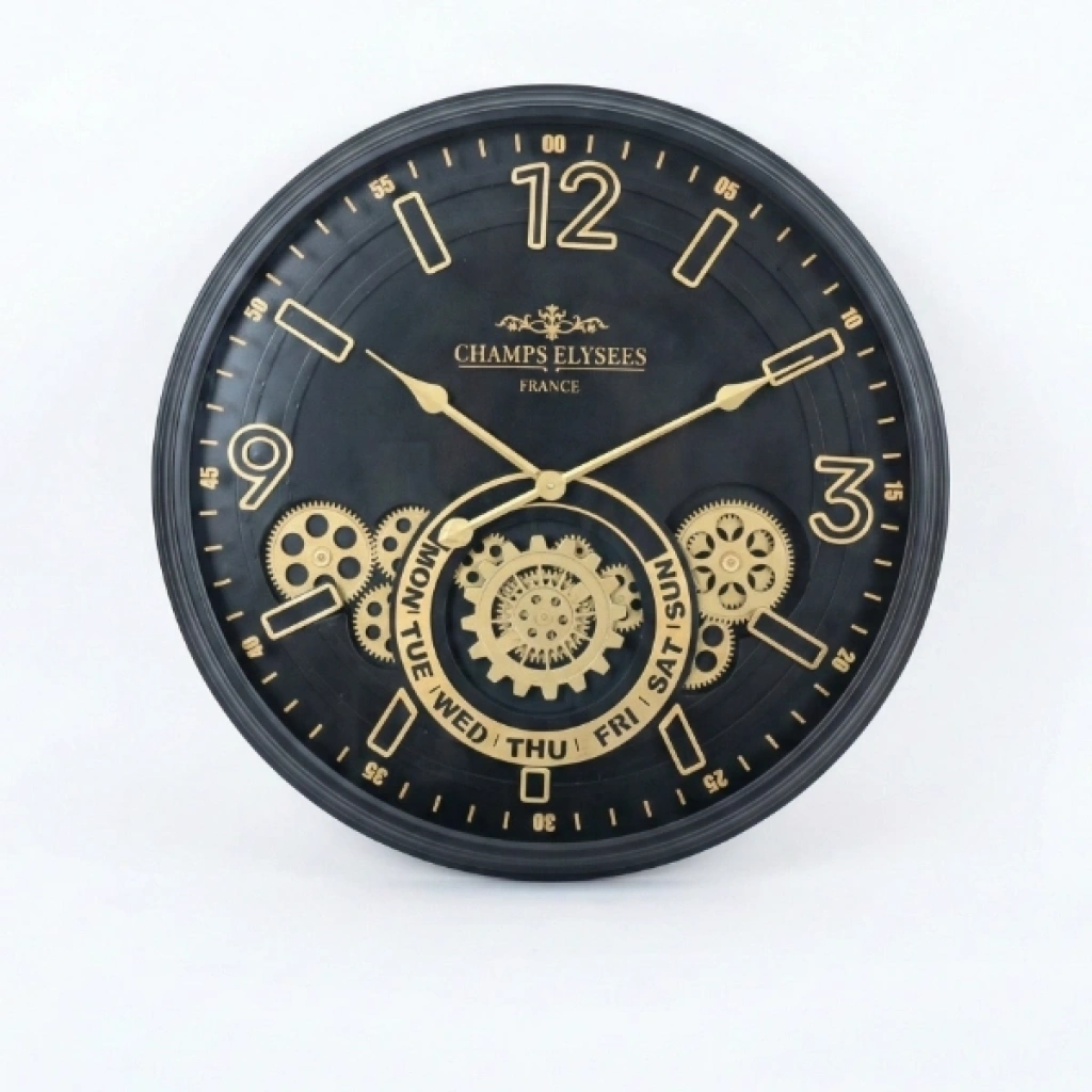 ÇARKLI DUVAR SAATİ ALTIN RENGİ DETAYLI 59 CMÜrün ÖzellikleriÇarklı duvar saati altın rengi detaylı 59 cm modeli, klasik saat estetiğini modern endüstriyel tasarım anlayışıyla birleştirerek yaşam alanlarına güçlü ve sofistike bir atmosfer kazandırır. Geniş 59 cm çapı sayesinde duvarda tek başına dikkat çekici bir dekoratif unsur olarak öne çıkar ve özellikle salon, ofis, kafe, restoran ve loft tarzı mekânlar için ideal bir tercih sunar. Siyah zemin üzerine işlenen altın rengi çark detayları, saate mekanik bir derinlik kazandırırken dekorasyonda lüks ve prestijli bir görünüm oluşturur. Büyük ve net rakam yapısı uzaktan rahatlıkla okunabilirlik sağlarken, altın tonlu akrep ve yelkovan tasarımı saatin genel estetiğini tamamlar. Sessiz akan mekanizması sayesinde çalışma alanlarında, dinlenme odalarında ve sosyal mekânlarda rahatsızlık yaratmadan konforlu kullanım sunar. Dayanıklı gövde yapısı uzun ömürlü kullanım için tasarlanmış olup duvara kolay monte edilebilir yapıdadır. Zamansız tasarımı ile hem klasik hem modern dekorasyon stillerine uyum sağlayarak mekânlara karakter kazandırır.Paket İçeriği1 adet çarklı duvar saati altın rengi detaylı 59 cm