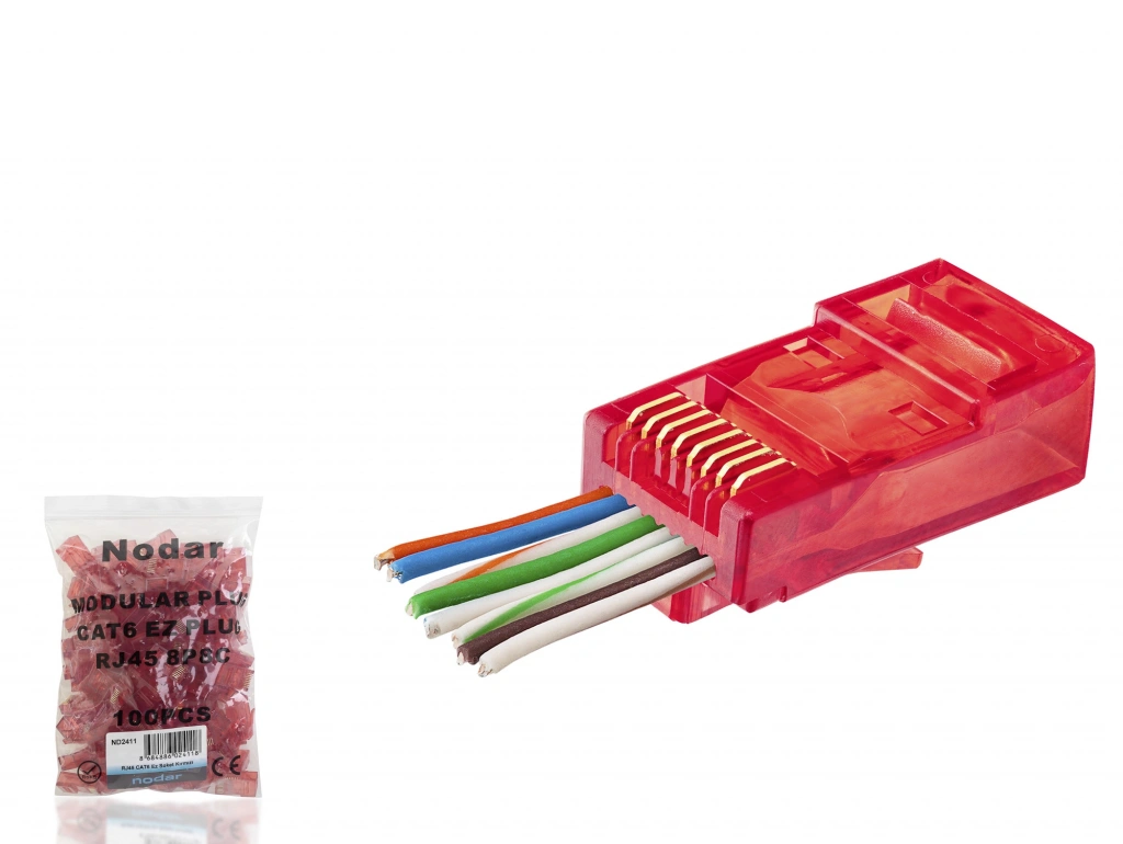 ND2411, Profesyonel Ağ Altyapı Çalışmalarında Montaj Verimliliğini Artırmak Ve Hata Oranını Sıfıra İndirmek İçin Tasarlanmış Ez (easy) Tipi Delikli RJ45 Konnektör Setidir. Dikkat Çekici Şeffaf Kırmızı Rengi, Karmaşık Kablo Tesisatlarında Kritik Veri Hatlarının Veya Özel Network Segmentlerinin Anında Ayırt Edilmesini Sağlar. Ez (pass-through) Teknolojisi Sayesinde Kablo Damarları Konnektörün Ön Ucundan Dışarı Çıkar; Bu Da Çakma İşleminden Önce Renk Dizilimini Kolayca Doğrulamanıza Ve Damarların Pinlere Tam Temas Ettiğinden Emin Olmanıza İmkan Tanır.