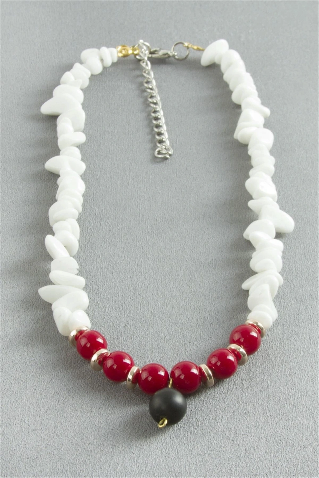 Kolye; Ürün malzemesi sedef ve ceyt doğaltaştır. Ürün boyu 40 cmdir. 8 mm doğaltaş kullanılmıştır.