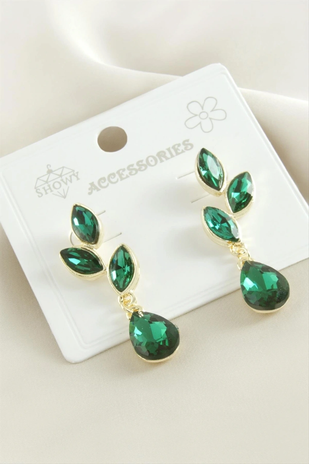 Küpe; Ürün malzemesi metal ve taşlıdır. Ürün boyu 5 cmdir. 1 sınıf kaliteli malzemeden üretilmiştir. Kartlıdır.