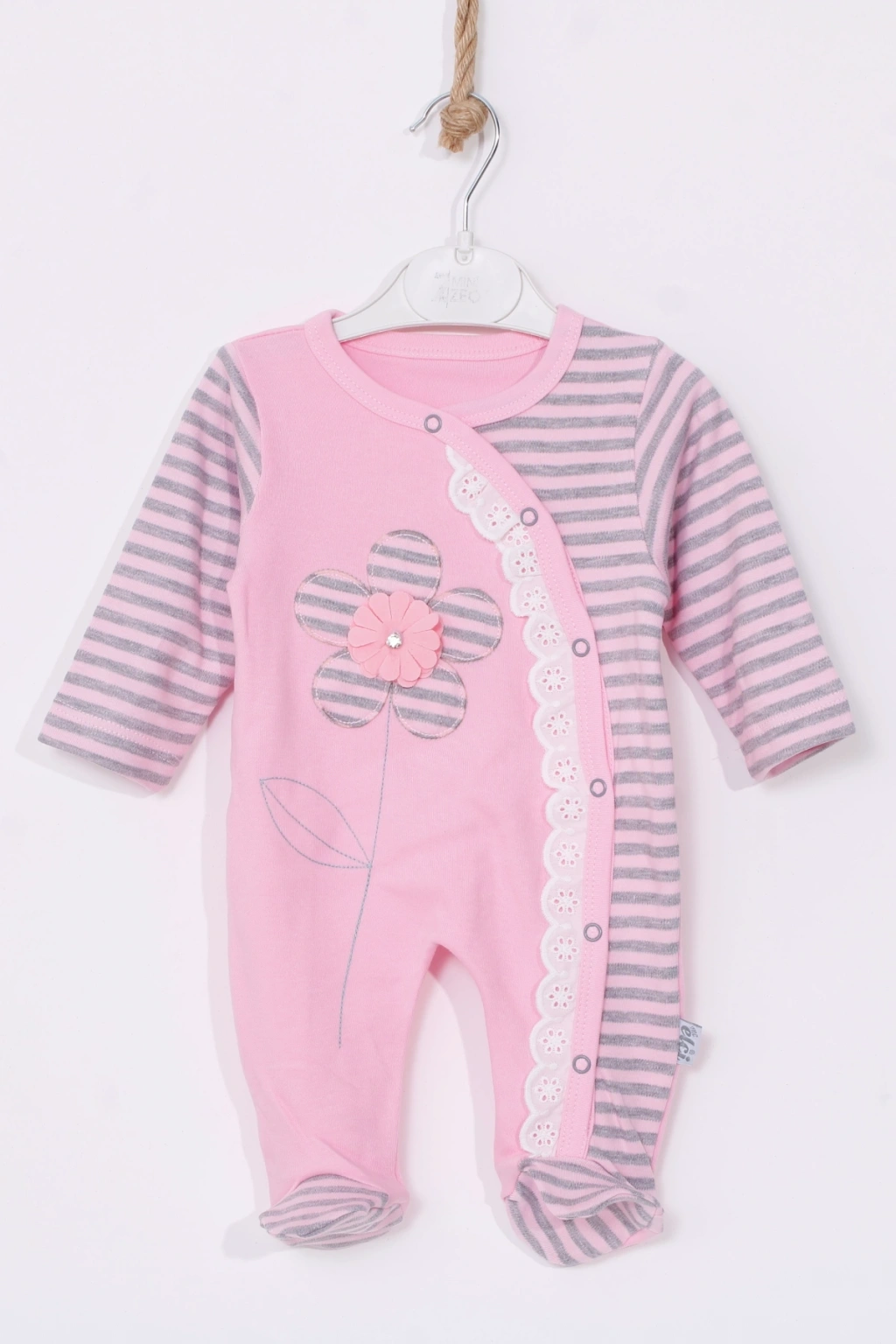 Çiçek Nakışlı % 100 Pamuk Ayaklı Kız Bebek Tulumu