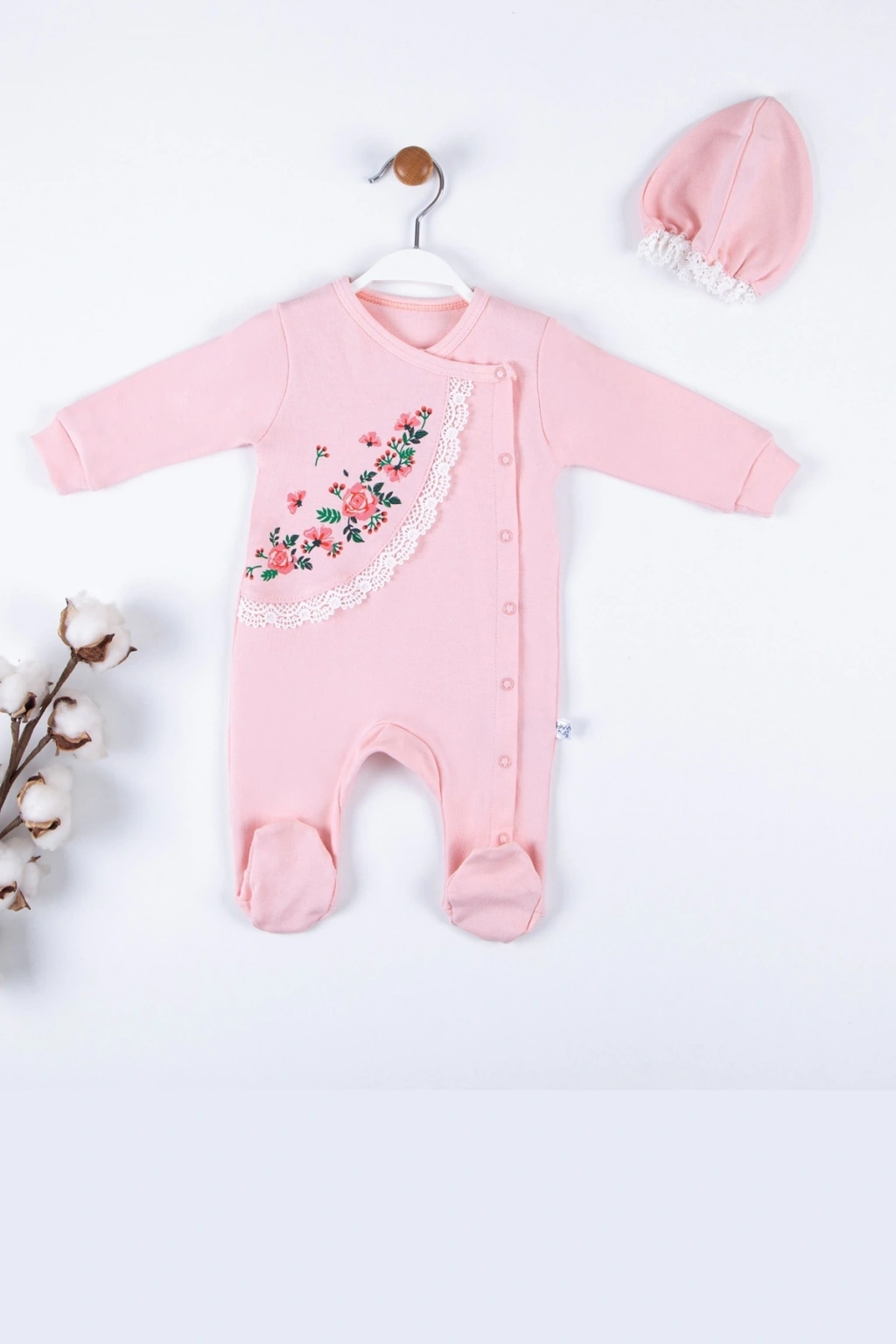 Çiçek Nakışlı Şapkalı % 100 Pamuk Kız Bebek Tulumu