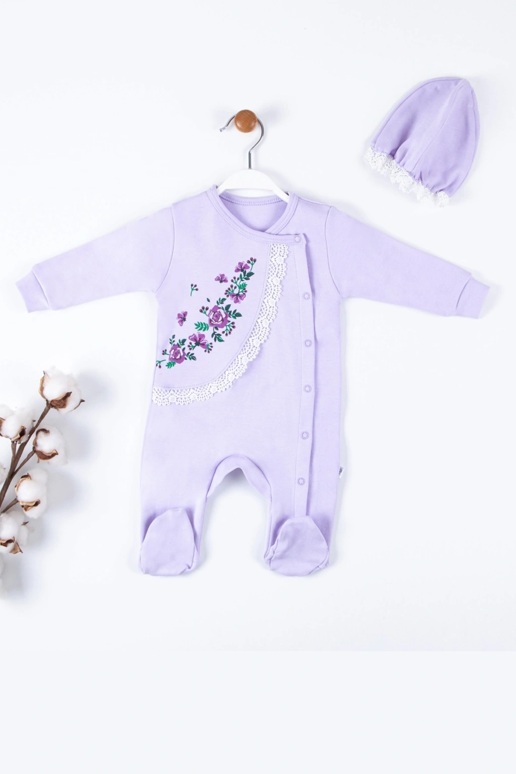 Çiçek Nakışlı Şapkalı % 100 Pamuk Kız Bebek Tulumu.