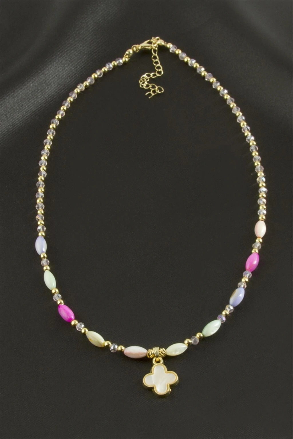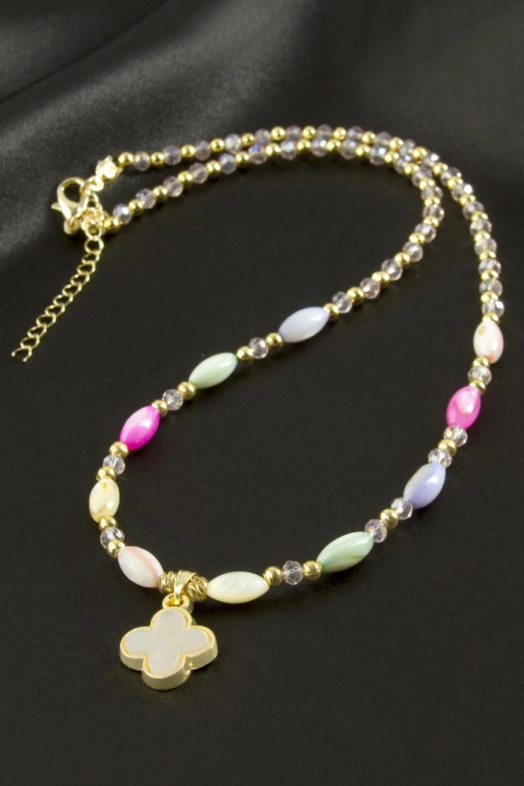 Kolye; Ürün malzemesi cam boncuk, dorika, kristal ve metaldir. Kolye boyu 45 cmdir. Ucundaki figür boyu 1,5 cmdir. Kartlıdır. 1 sınıf kaliteli malzemeden üretilmiştir.