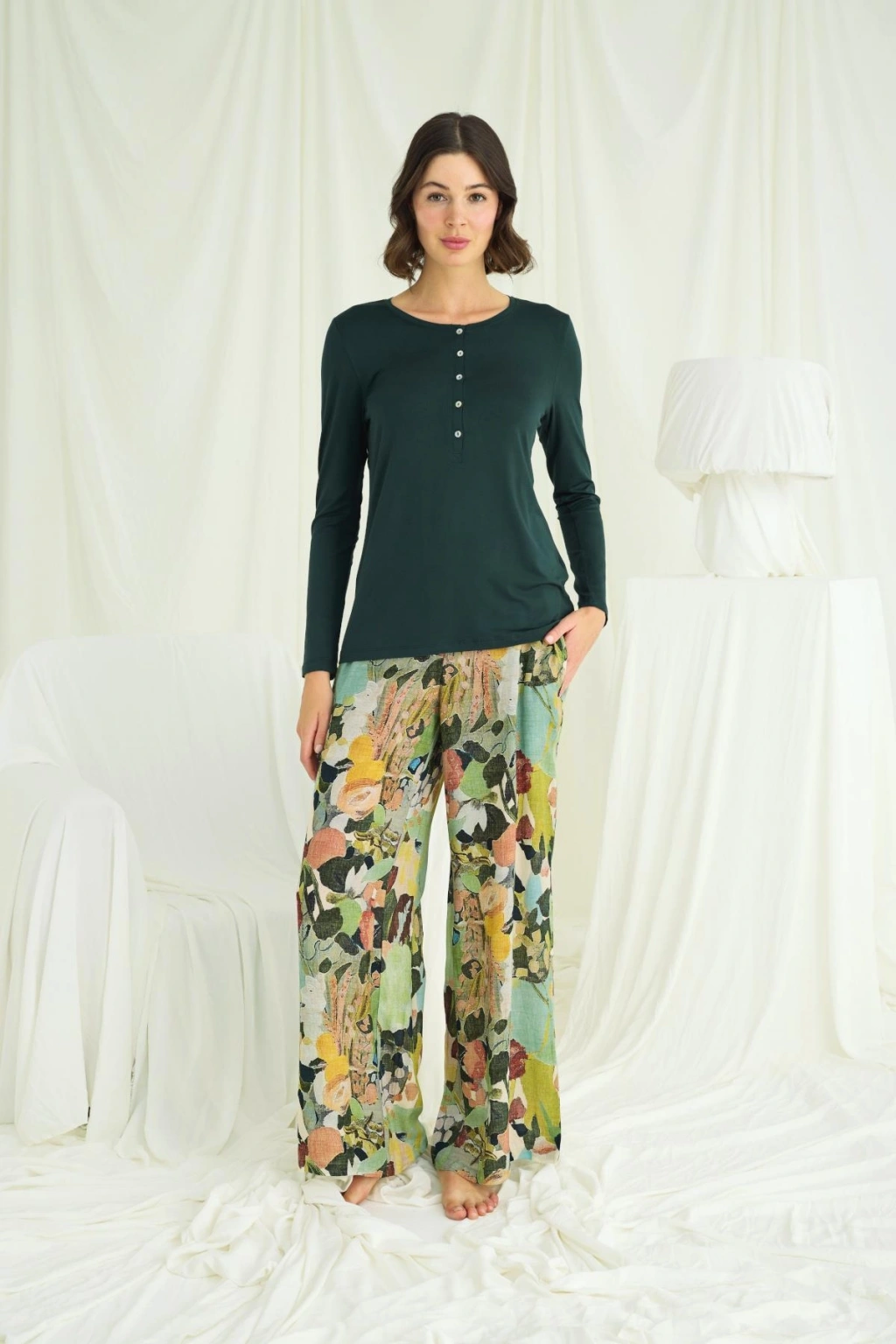Çiçek Yaprak Ve Etnik Desenli Uzun Kollu Pijama Takımı