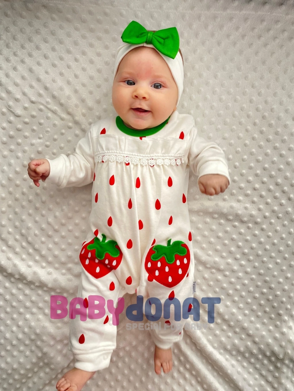 Çilek Nakışlı % 100 Pamuk Kız Bebek Tulumu