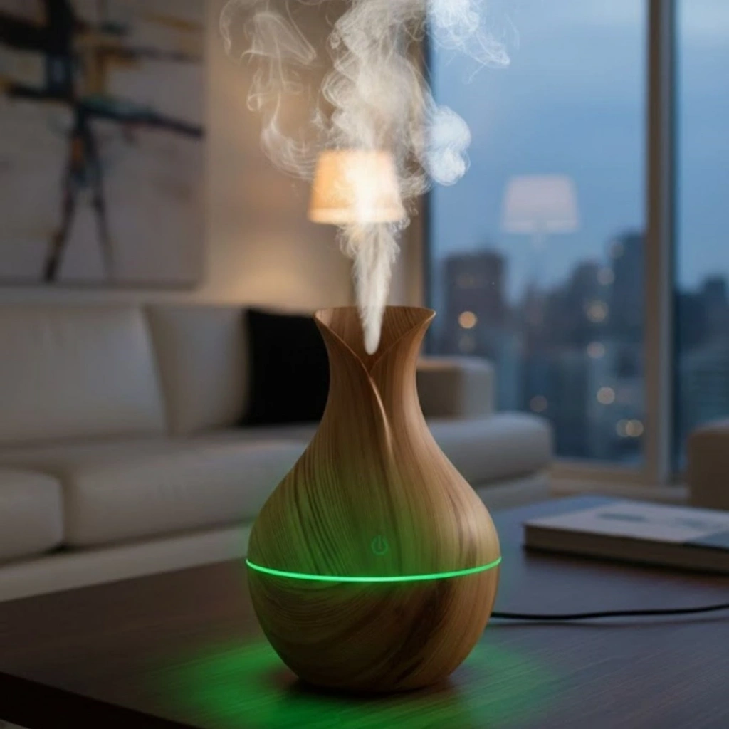 Dayanıklı malzemeden üretilmiş yapısı uzun ömürlü kullanım sağlarken, LED ışıklı ve ultrasonik sistemiyle modern yaşam alanlarının vazgeçilmez bir parçası haline gelir. Doğal akasya rengi, sade ve şık görünümüyle bulunduğu ortama sıcaklık katar.