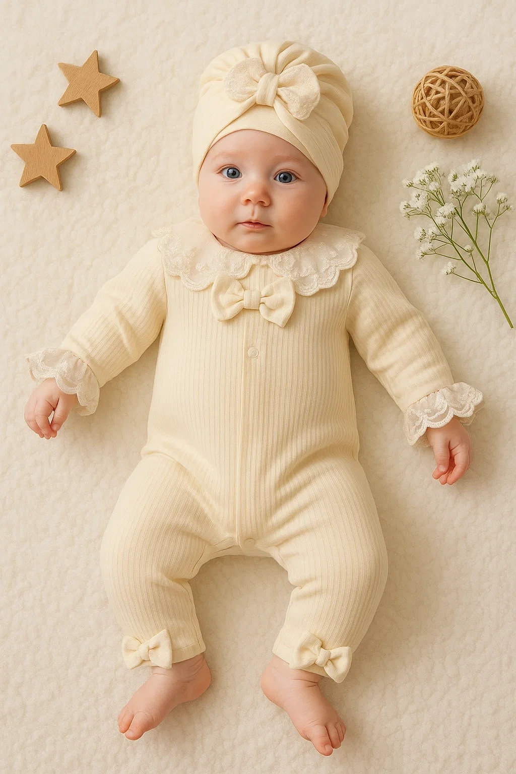 Dantel Yaka Detaylı Şapkalı 2'Li Kız Bebek Tulum