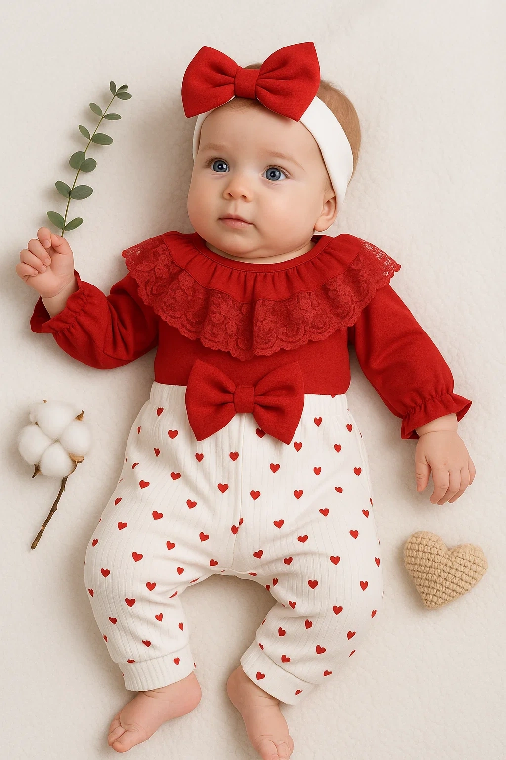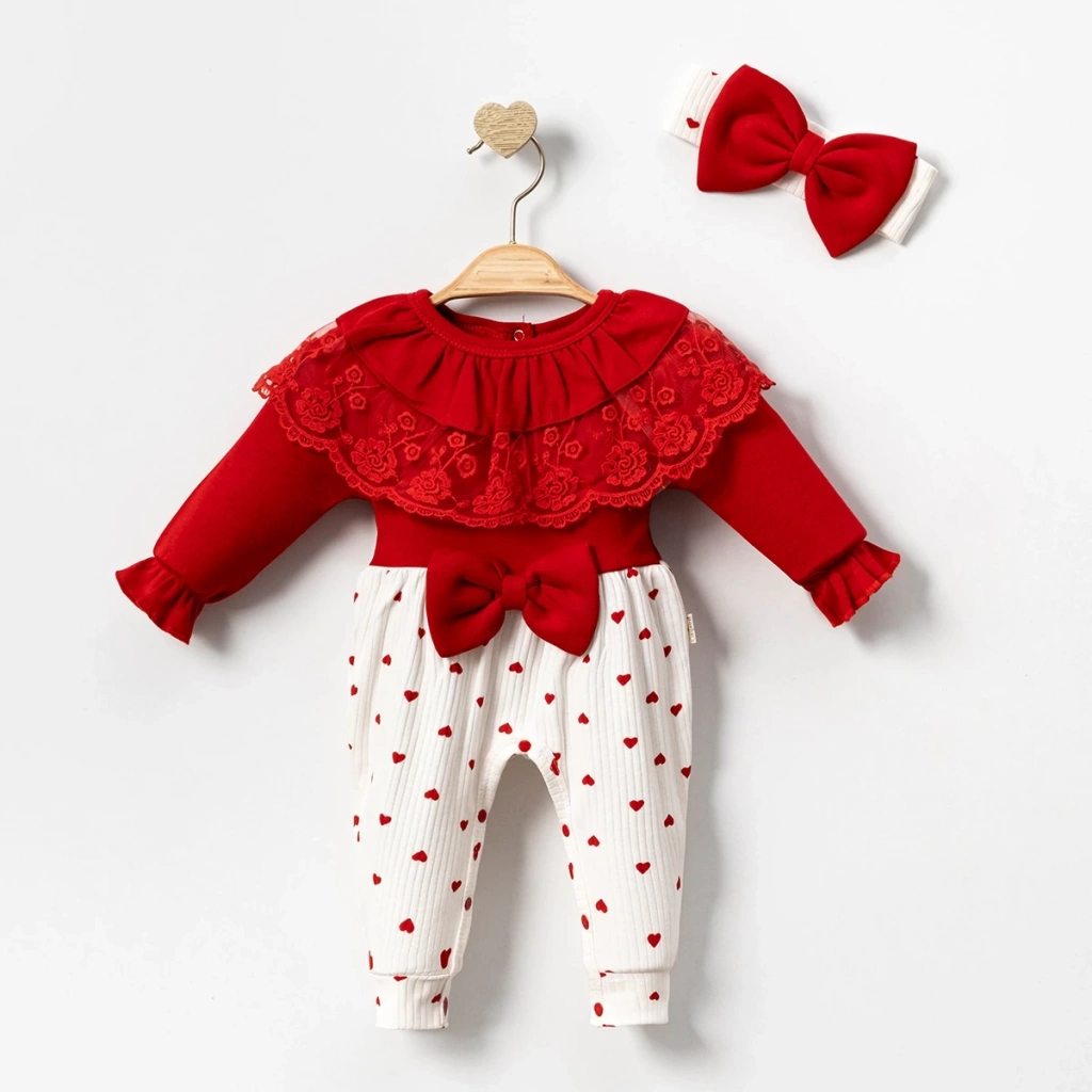 Kız Bebek Kalp Desenli Waffle Bandanalı 2'li Tulum