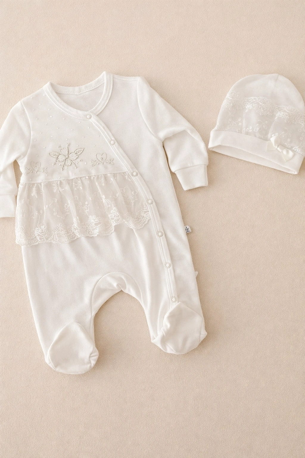 Bebeğinizin hassas cildi düşünülerek tasarlanan Dantelli Çiçek Nakışlı Kız Bebek Tulum, zarif detayları ve %100 pamuk kumaşı ile hem şıklığı hem konforu bir arada sunar. Yumuşacık dokusu sayesinde bebeğiniz gün boyu rahat ederken, dantel ve çiçek nakış detayları ile özel günlerde de göz alıcı bir görünüm sağlar.