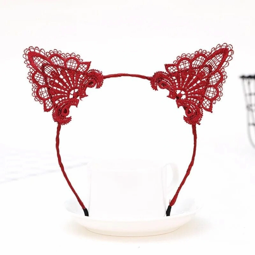 Dantelli Kırmızı Kedi Tacı - Vintage Tarz Dantel Kedi Kulak