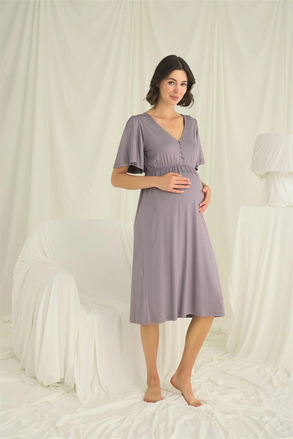 Dantelli Önden Düğmeli Hamile Lohusa Gecelik