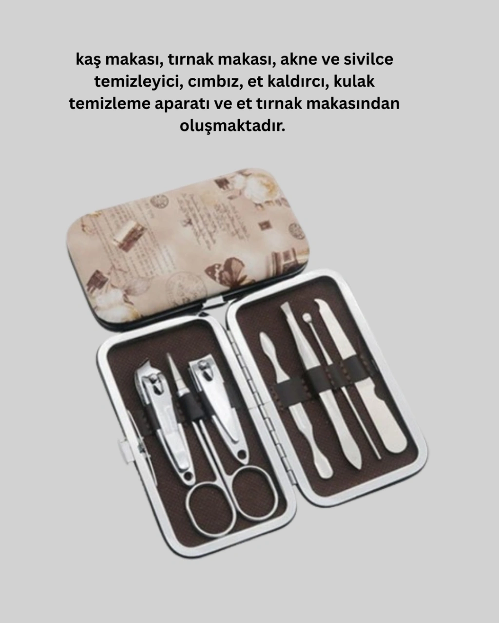 Kompakt tasarımı ve çok yönlü kullanımıyla bu kişisel bakım seti, hem kadınlar hem erkekler için ideal bir üründür. İçeriğinde bulunan tırnak makası, kaş makası, cımbız, kulak temizleme atı, et tırnak makası, et kaldırıcı ve sivilce temizleyici atlar sayesinde kişisel bakımınızı eksiksiz şekilde tamamlayabilirsiniz. Paslanmaz çelikten üretilmiş olan parçalar sağlamlığıyla uzun yıllar kullanım sunar. Şık çantası, hem düzenli saklama hem de kolay taşıma imkanı sağlar. Küçük boyutları sayesinde çantanızda fazla yer kaplamaz ve her yerde kullanım kolaylığı sağlar. Günlük kişisel bakımını önemseyen herkes için kaliteli ve pratik bir tercihtir.