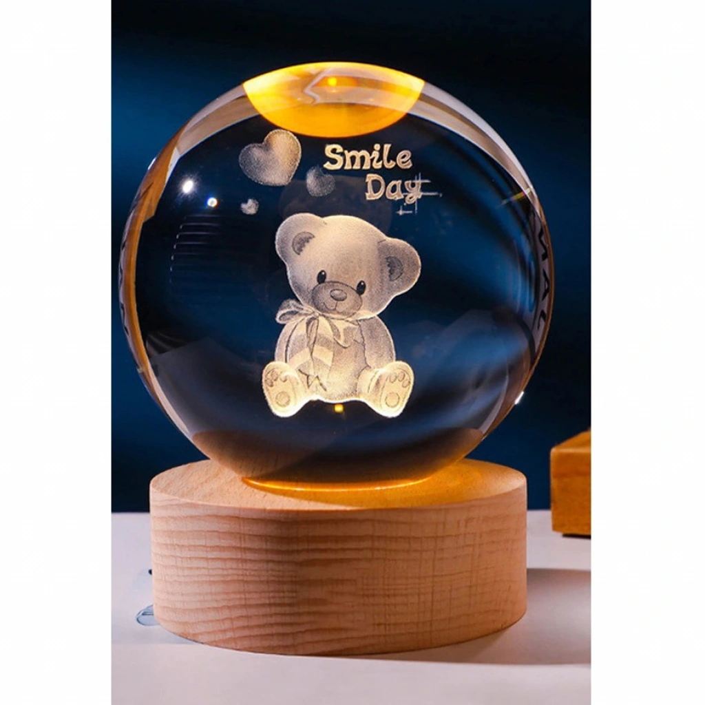Dekoratif Ayıcık Tasarımlı Ahşap Altlıklı Işıklı Cam Küre Cam 6 Cm Ahşap 2 Cm