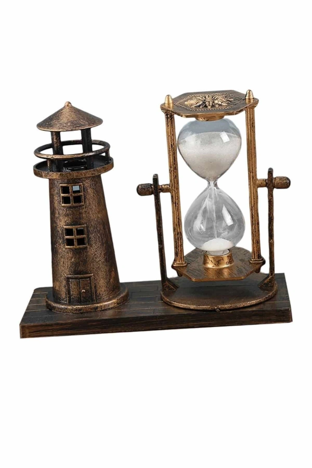 Modern ve Es TasarımBu özel kum saati, klasik kum saatlerinin modern bir yorumu olarak tasarlanmıştır. Deniz feneri figürüyle birleşen zarif formu, her tarza uyum sağlayabilecek bir dekorasyon öğesi olmasını sağlıyor. Cam bölmeler içerisindeki ince kum tanecikleri, üst hazneden alt hazneye süzülerek akarken büyüleyici bir görsel şölen sunuyor. Hareketli yapısıyla zamanı ölçmenin geleneksel bir yolunu hatırlatırken, aynı zamanda ortamın atmosferine sofistike bir dokunuş katıyor. Ofislerde masa üstünde veya çalışma odalarında huzurlu bir atmosfer yaratmak için ideal bir seçimdir.
