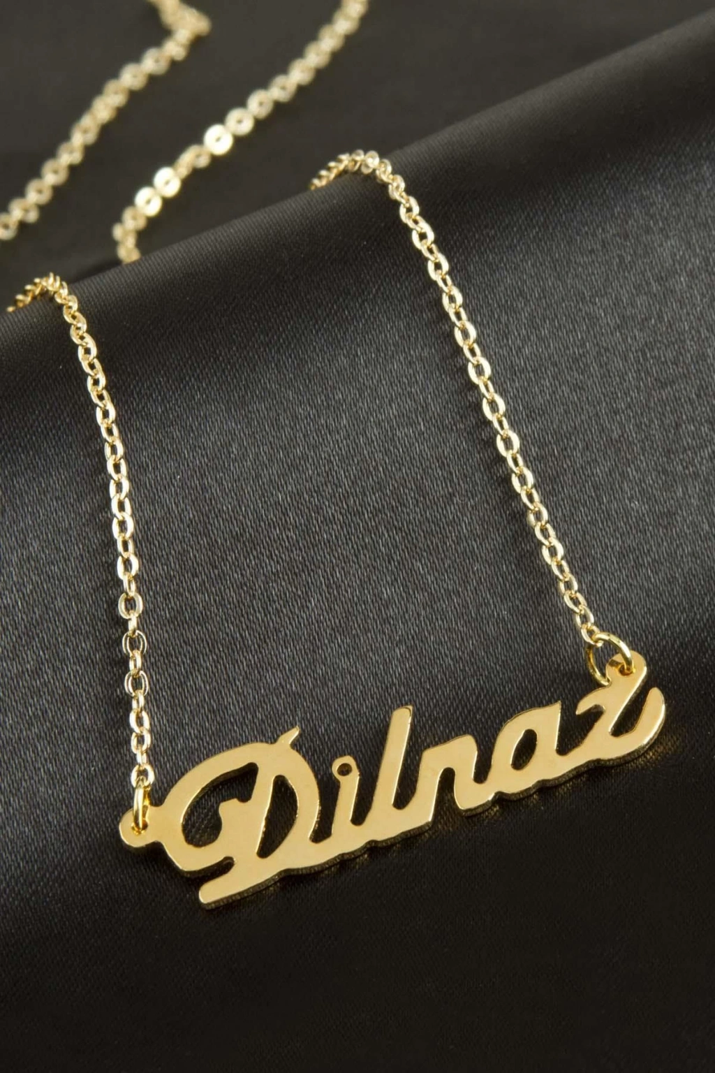Dilnaz İsimli Kolye. İsimli kolye pirinç madeninden ve altın kaplamalıdır. Kişiye özel üretilmektedir.Yazdırmak istediğiniz ismi bize mesaj olarak iletmeniz gerekmektedir. Kullanıma bağlı olarak uzun süre kullanıma uygundur. Ürün malzemesi 1.sınıf kalitededir. Ürün ve zinciri sarı renktedir. Ürün zincir boyu 45 cm ve ürün üzerindeki isimler yaklaşık 3 cmdir. İsim boyları ürün ismine göre degişiklik göstermektedir.