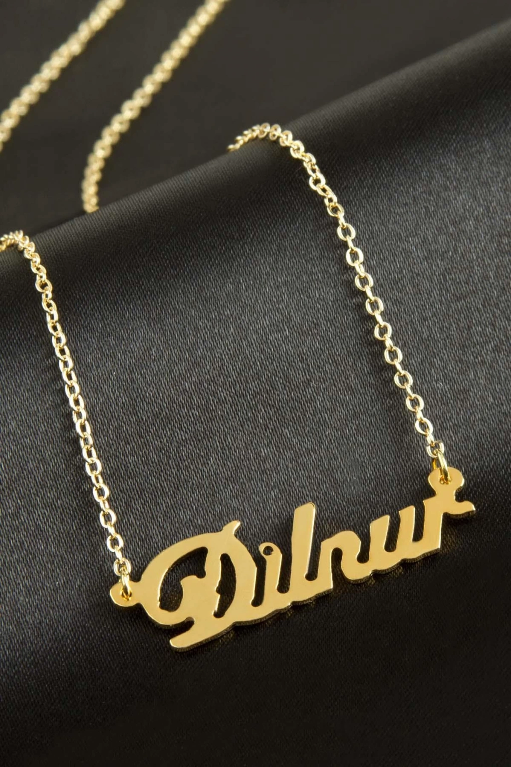 Dilnur İsimli Kolye. İsimli kolye pirinç madeninden ve altın kaplamalıdır. Kişiye özel üretilmektedir.Yazdırmak istediğiniz ismi bize mesaj olarak iletmeniz gerekmektedir. Kullanıma bağlı olarak uzun süre kullanıma uygundur. Ürün malzemesi 1.sınıf kalitededir. Ürün ve zinciri sarı renktedir. Ürün zincir boyu 45 cm ve ürün üzerindeki isimler yaklaşık 3 cmdir. İsim boyları ürün ismine göre degişiklik göstermektedir.