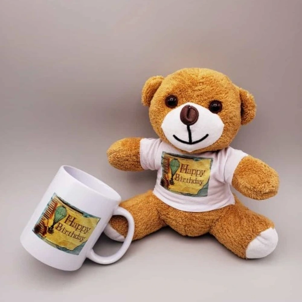 Doğum Günü Hediye Seti Doğum günlerinin en sevilen hediye alternatiflerinden biri olan Peluş Ayıcık ve Kupa Seti, sevdiklerinize verebileceğiniz en anlamlı ve özel hediye seçeneklerinden biridir. Kahverengi peluş ayıcık üzerinde bulunan Happy Birthday baskılı tişört, hediye setine sevimli bir dokunuş katarken, yanında yer alan baskılı porselen kupa ise şık tasarımıyla dikkat çeker.Bu özel set; arkadaşlarınıza, sevgilinize, eşinize ya da ailenizden birine doğum gününde verebileceğiniz duygusal ve şık bir hediyedir. Hem dekoratif hem de kullanışlı olması sebebiyle her yaşa hitap eder.Ürün ÖzellikleriKahverengi peluş ayı yüksek kaliteli malzemeden üretilmiştir.Porselen Happy Birthday baskılı kupa bardak dayanıklı ve şık yapıdadır.Ayıcık üzerindeki baskılı mini tişört kaliteli kumaştan üretilmiştir.Özel günlerin vazgeçilmez hediye setlerinden biridir.Hem tasarımı hem de görünümü ile dikkat çeken modern bir settir.Ürün ÖlçüleriPeluş Ayıcık: 25 cmBaskılı Tişört: 11 cm x 16 cmKupa Bardak: 8 cm x 10 cmNOT: Tişörtler ayıcığa giydirilmeden gönderilmektedir.