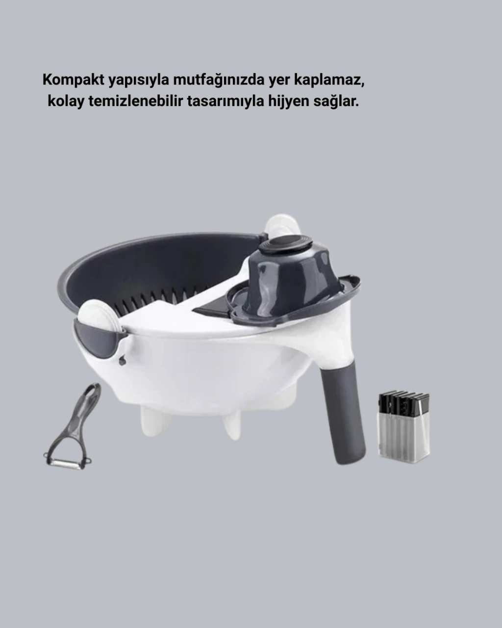 Pratik mutfak çözümleri sunan 5’i 1 arada Döner Süzgeçli Rende, kullanıcıların yemek hazırlama süreçlerini hızlandırmak, dağınıklığı azaltmak ve güvenliği artırmak için özel olarak geliştirilmiştir. Ürün, birden fazla kesme ve rendeleme görevini tek bir cihazda topladığı için hem alan tasarrufu sağlar hem de çok yönlü kullanım sunar.Döner mekanizmalı tasarım, bıçakların saniyeler içinde değiştirilebilmesini sağlar. İnce rende, kalın rende, yuvarlak dilim, ince şerit ve standart doğrama modları ile birden fazla sebzeyi hızlıca hazırlayabilirsiniz. Bu özellik, salata yapımından yemek hazırlamaya, garnitür hazırlamadan tatlı üstü süslemelerine kadar birçok kullanım alanı sunar.Cihazın haznesi, doğrama sırasında yiyeceklerin tek noktada toplanmasını sağlar ve mutfak tezgahını temiz tutar. Ayrıca aynı hazne, delikli yapısı sayesinde süzgeç görevi görür. Bu sayede sebzeleri doğradıktan sonra hemen yıkayabilir ve süzebilirsiniz; ekstra süzgeç kullanma gerekliliği ortadan kalkar.Kaymaz taban tasarımı, ürünün kullanım sırasında sabit kalmasına yardımcı olur. Çalışırken ilerlemeyen ve devrilmeyen bir yapı sunar. El koruma atı ise özellikle küçük veya ince sebzelerin doğranması sırasında parmakların korunmasını sağlar ve güvenliği artırır.Ergonomik gövdesi, uzun süreli kullanımda rahatlık sağlar. Tüm parçalar kolayca sökülüp takılabilir şekilde tasarlanmıştır. Bu özellik, cihazı temizlemeyi son derece pratik hale getirir. Paslanmaz çelik bıçaklar keskinliğini uzun süre korur ve hijyenik kullanım sunar.Yer kaplamayan kompakt tasarım, mutfak dolaplarında rahat saklama imkânı sağlar. Hem küçük mutfaklar hem büyük mutfaklar için ideal bir yardımcıdır. Ev yemeklerinde hız arayanlar, sağlıklı beslenenler, diyet yapanlar, öğrenci evleri ve pratik mutfak ürünlerine ihtiyaç duyan herkes için mükemmel bir seçimdir.