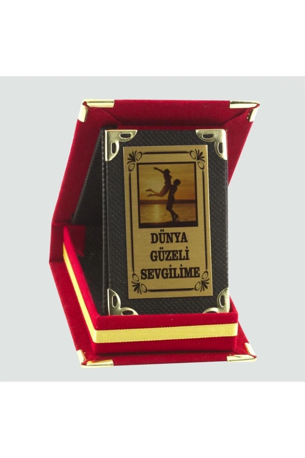 Süet kutulu plaket, metal üzerine yazı yazılarak üretilmiştir, ölçüleri kurulu vaziyette; yükseklik: 11cm, genişlik: 8cm'dir.