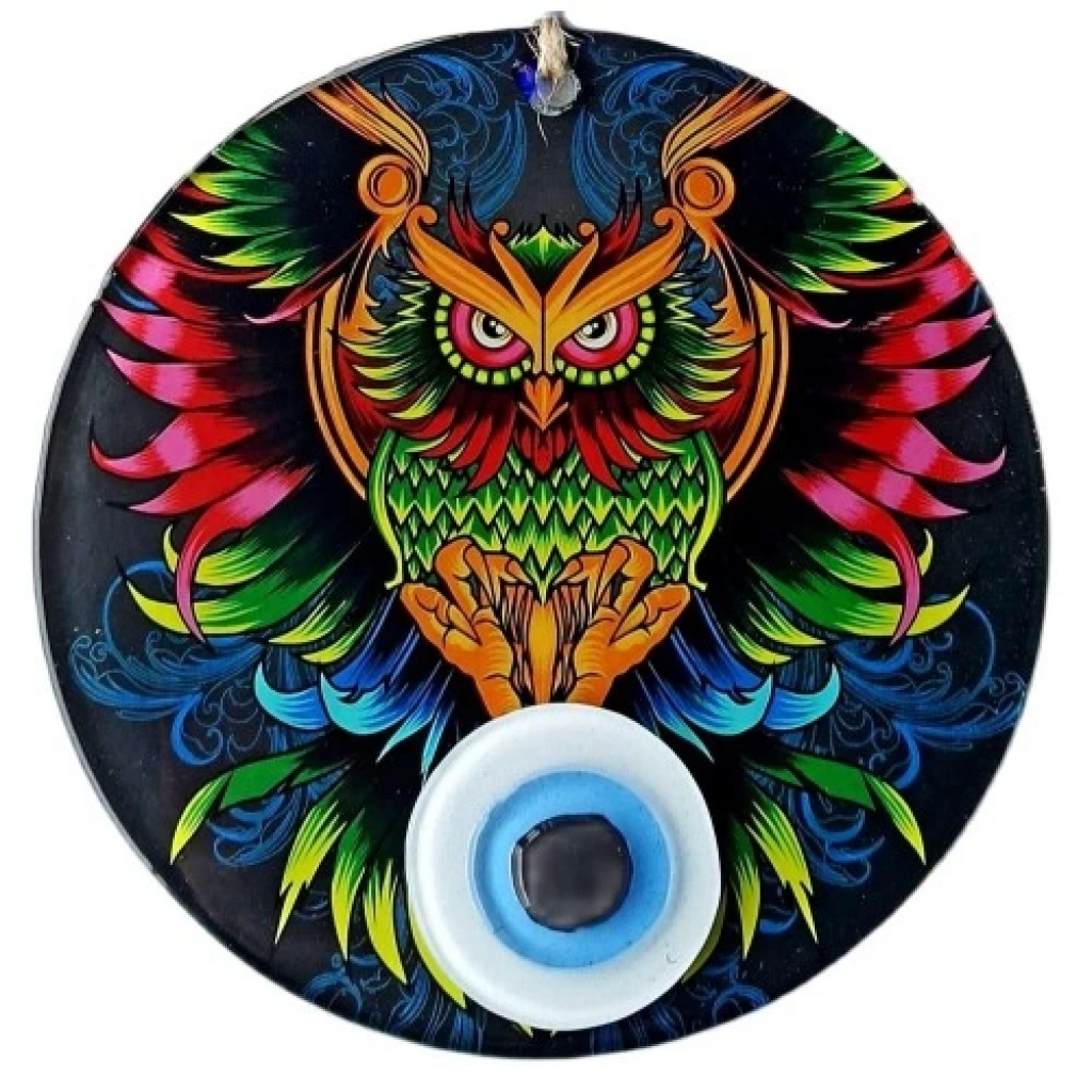 Efsane Baykuş duvar süsümüz füzyon cam malzeme kullanılarak üretilmektedir. Ürünümüz 15 santimetre çapındadır. İp dahil 20 santimetre boyundadır.
