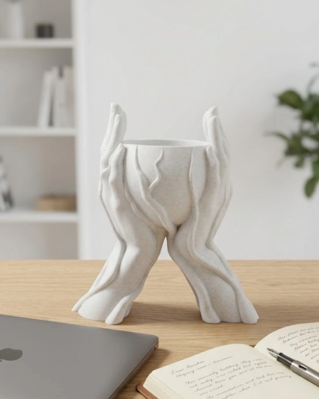 Dekoratif 3D el tasarımlı vazo saksı, modern dekorasyon anlayışını sanatsal tasarım ile bir araya getiren dikkat çekici bir dekoratif üründür. İki elin bir objeyi tutuyormuş gibi tasarlanması ürüne güçlü bir es karakter kazandırır. Bu özgün tasarım sayesinde ürün yalnızca bir saksı değil aynı zamanda dekoratif bir sanat objesi olarak da kullanılabilir.3D baskı teknolojisi ile üretilen bu dekoratif vazo, detaylı el figürü ve modern yüzey tasarımı sayesinde oldukça etkileyici bir görünüm sunar. Eller tarafından destekleniyormuş hissi veren bu tasarım, ev dekorasyonunda sanatsal bir dokunuş oluşturur.Dekoratif el tasarımlı saksı vazo özellikle küçük bitkiler için ideal bir kullanım alanı sunar. Sukulent bitkiler, kaktüsler veya küçük dekoratif çiçekler ile kullanıldığında oldukça es bir görünüm elde edilir. Bunun dışında masa dekoru, kalemlik veya raf süsü olarak da kullanılabilir.Modern ev dekorasyonlarında, minimalist salonlarda, çalışma odalarında veya ofis ortamlarında oldukça şık bir dekoratif aksesuar olarak kullanılabilir. Kitaplık raflarında, sehpa üzerinde veya televizyon ünitesi üzerinde sergilendiğinde bulunduğu ortama sanatsal bir atmosfer kazandırır.Ayrıca dekoratif hediye arayanlar için de oldukça farklı ve özel bir alternatiftir. Ev hediyesi, doğum günü hediyesi, yeni ev hediyesi veya ofis hediyesi olarak tercih edilebilir.Modern tasarımı, es görünümü ve çok yönlü kullanım imkanı sayesinde dekoratif 3D el tasarımlı vazo yaşam alanlarında dikkat çeken şık bir dekor ürünüdür.